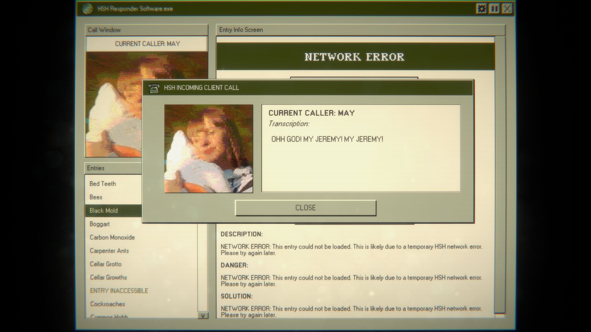I worked on the phones when I was in pension admin, years ago, and I fielded some weird ones, but nothing quite as weird as the calls in Home Safety Hotline. It's, technically, I suppose, a horror game about manning a call line through a 90s CRT-screen PC, where people will be like "my kitchen is full of droppings that look like coffee grounds, what do?". You look through your list of potential household hazards and select the right one, so your caller gets sent the info on dealing with cockroaches. Except as your week at HSH goes on, your calls start to be less roaches, more "my house smells like death and my dog is acting strangely" or "I can see someone looking through my window at night and hear them breathing heavily."