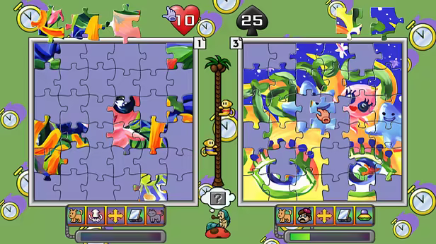 ジグソーパズルなのに対戦!?アイテムを利用して相手のジャマをしたりとスリリングな戦いが楽しめます。 じっくりとジグソーパズルが楽しめるひとりモードに加えて、「ジグソーの国のアリス」では不思議の国に迷い込んだアリスを元の世界に戻すためジグソーをクリアしましょう。
