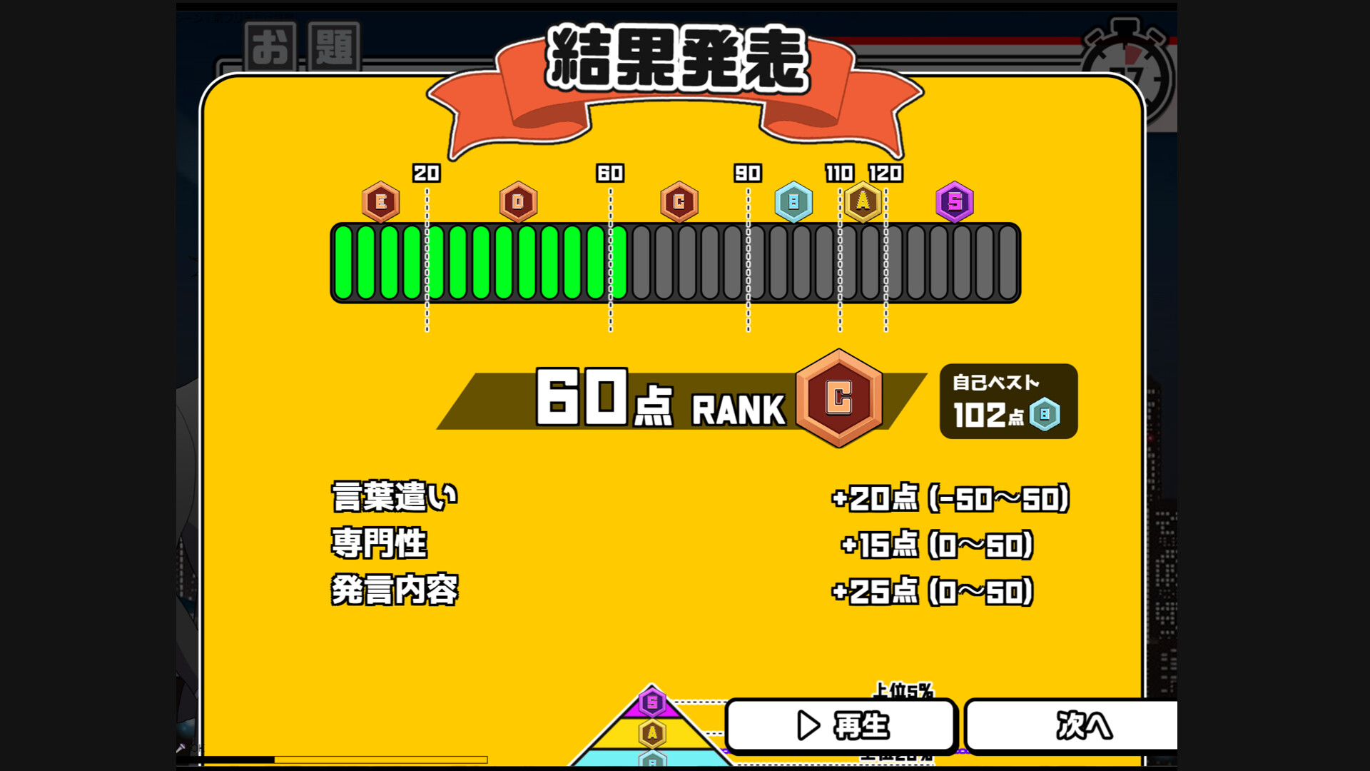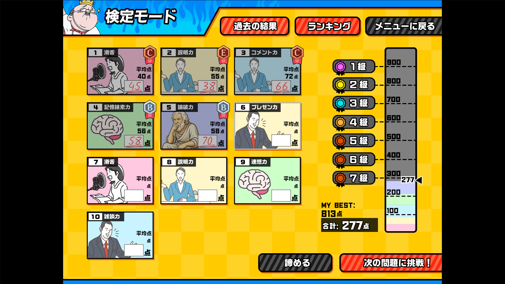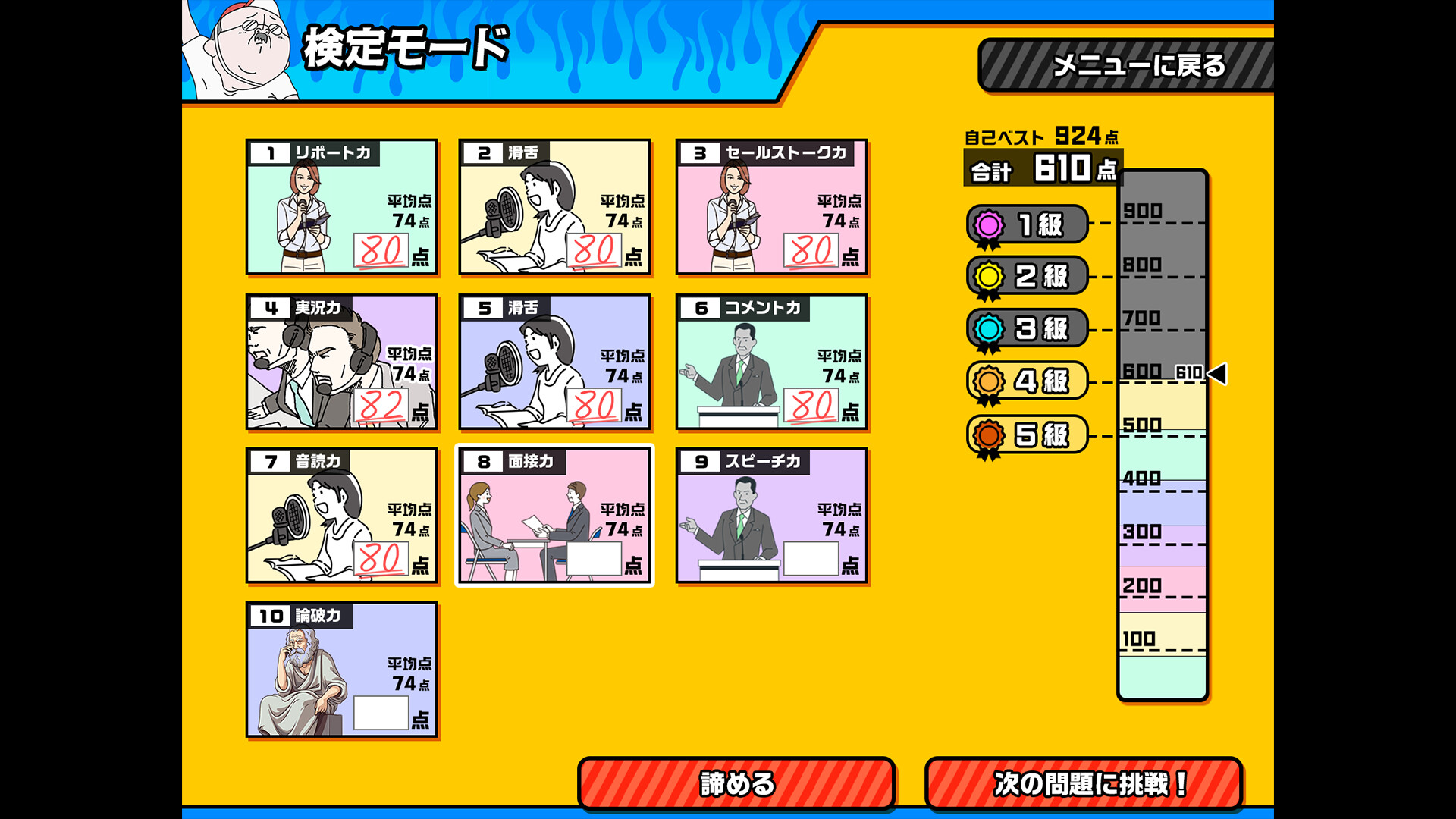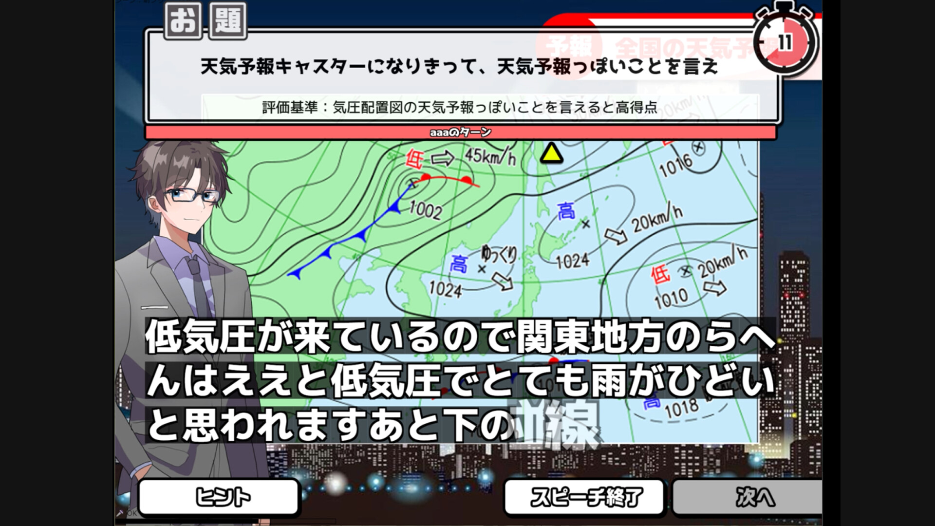 A game that tests your ad-lib verbal skills using a microphone. You can test your word power with various subjects, such as handling a bank robbery with just the power of words, or becoming a weathercaster and ad-libbing your way through a weather forecast.