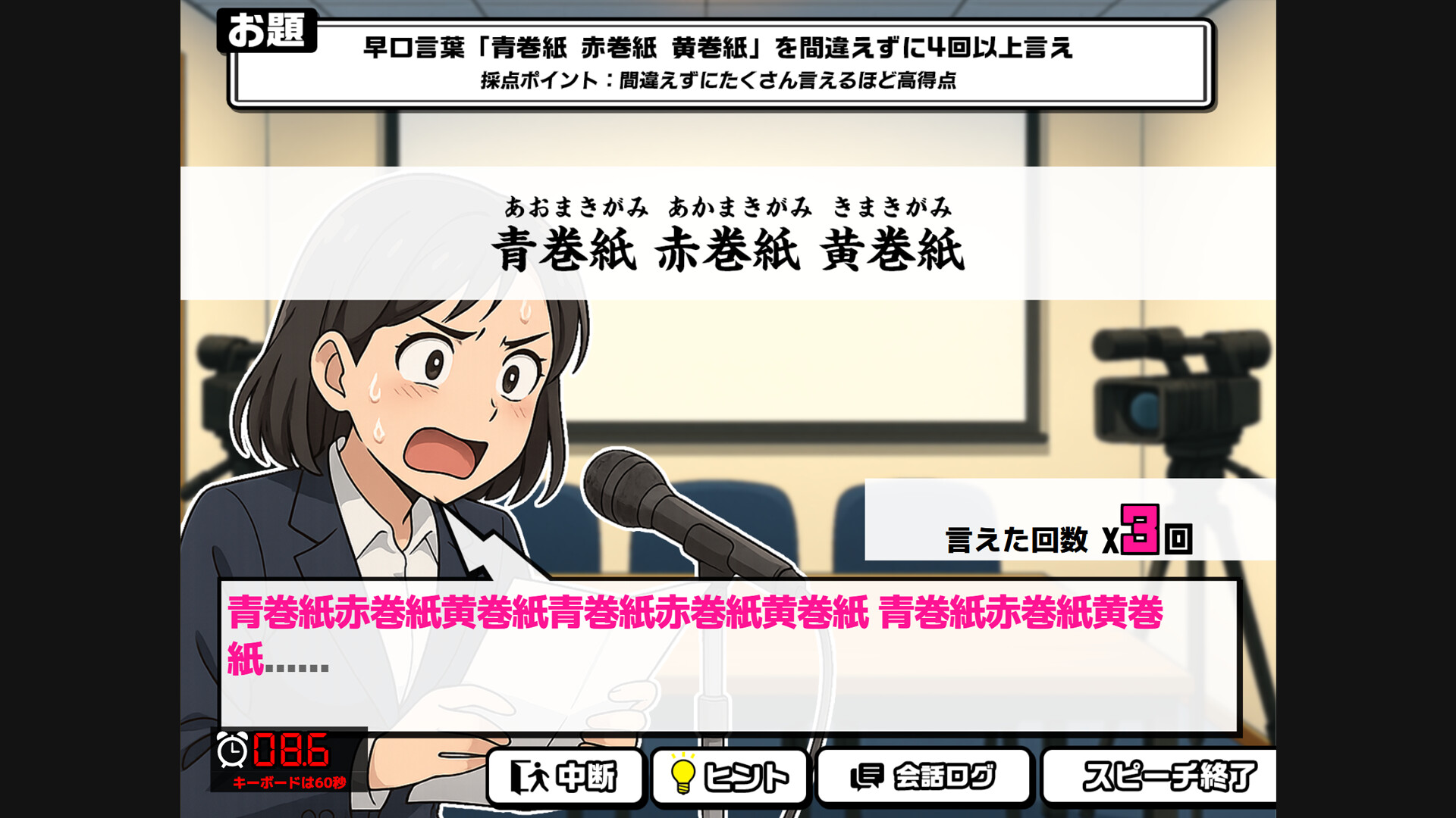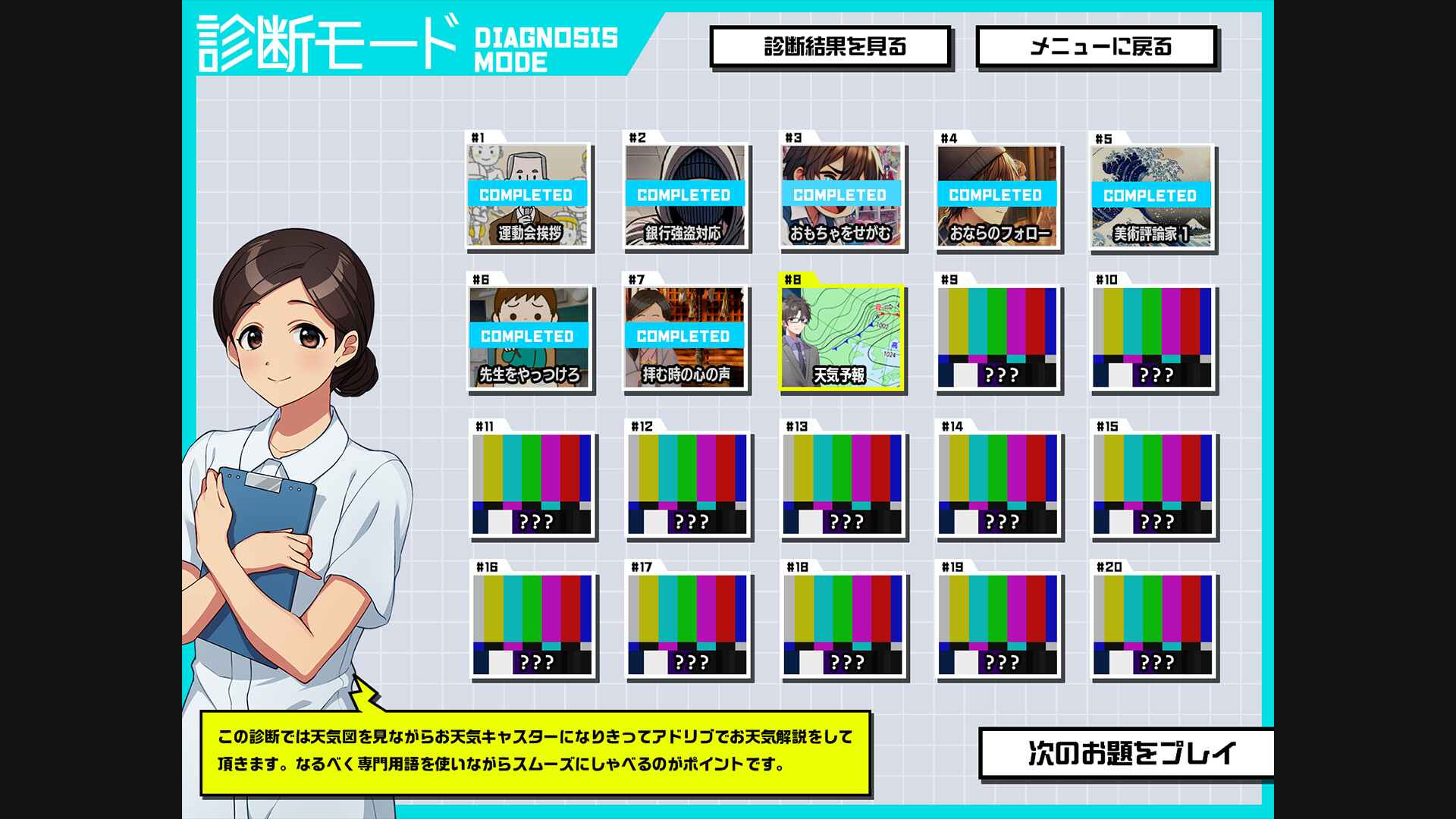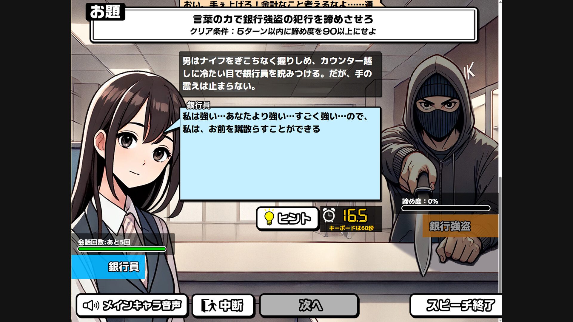 This game uses the AmiVoice speech recognition service provided by Advanced Media, Inc. for transcribing microphone input. If AmiVoice’s servers are down, the game may not be playable.