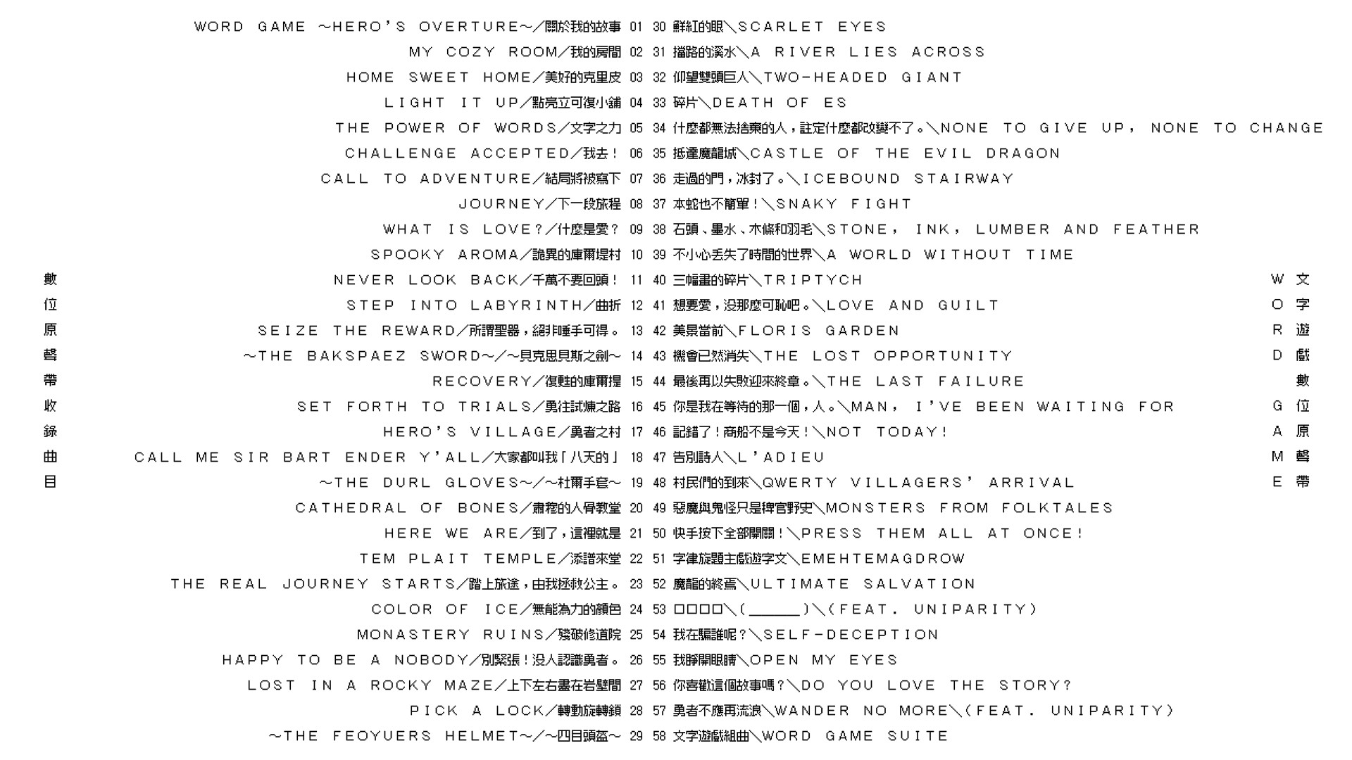 隨著「我」從懵懵懂懂的起步開始,直至壯闊的結束── 《文字遊戲》原聲帶作為聽覺的集大成專輯,遊戲中採用曲目58首全數收錄! 由詩人Triodust 統籌,管弦勇者林柏勲、鋼琴勇者顏罕倫、樂手勇者龍俊宇、歌唱勇者Uniparity合作錄製與製作;無論是刺激的戰鬥、神秘的謎題、感人的故事、令人興奮的發展, 《文字遊戲》原聲帶將帶著識字勇者們,回顧這趟奇幻冒險中無與倫比的聽覺饗宴。