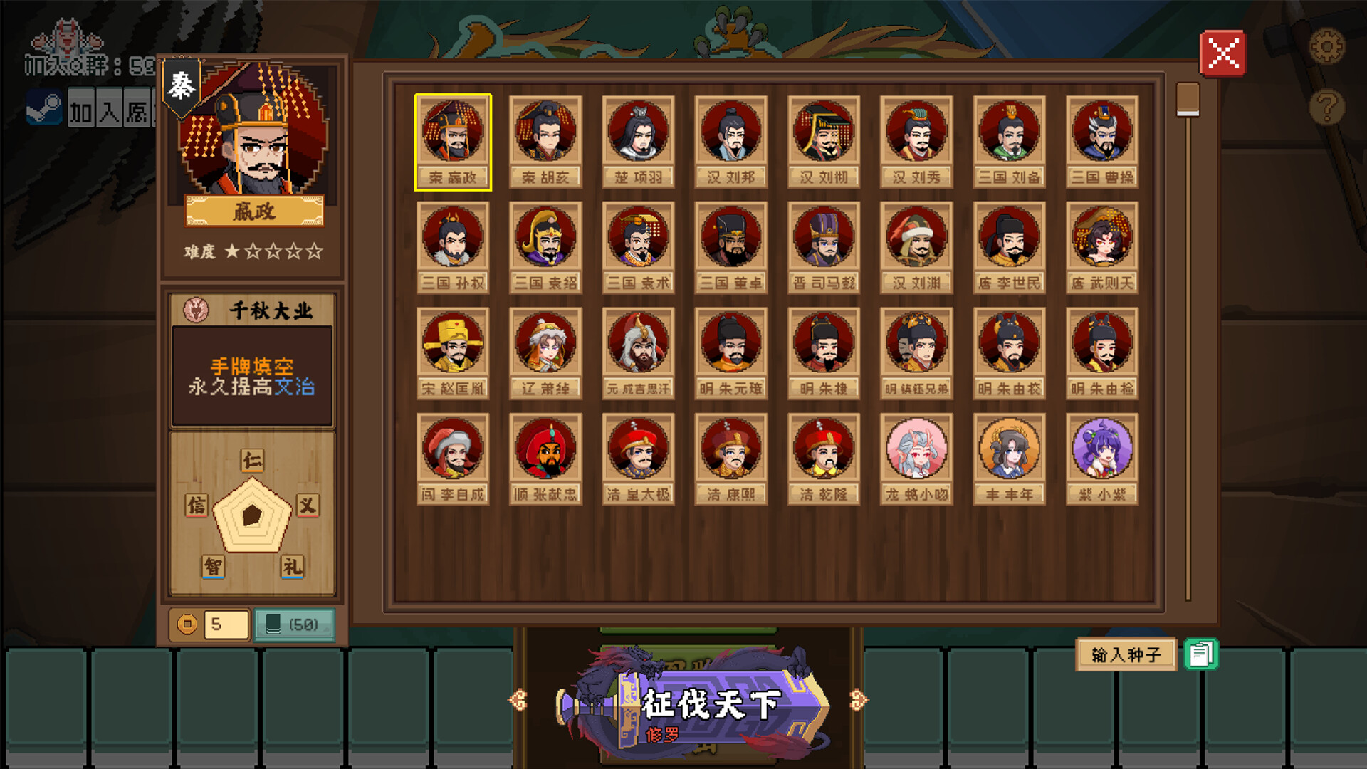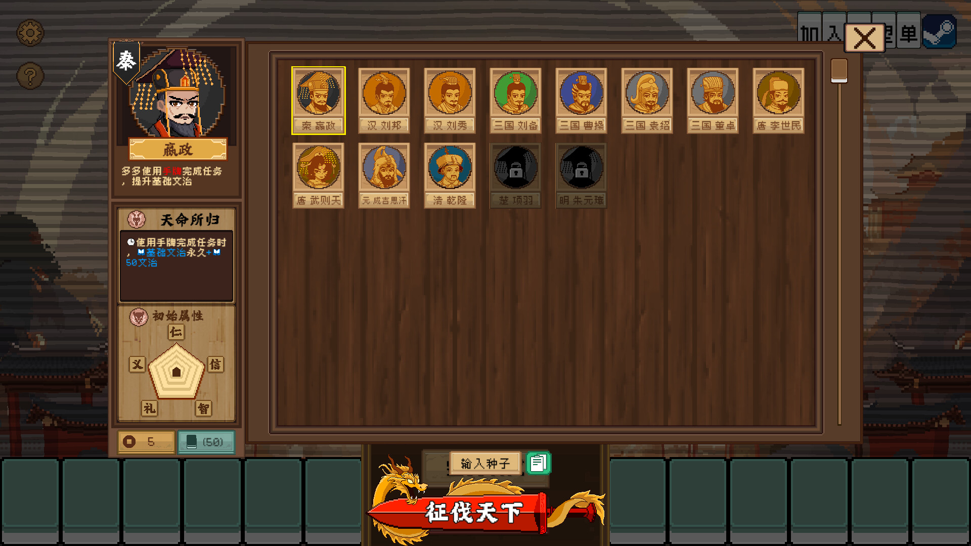 《皇帝游戏》是一款将皇帝扮演与卡牌构筑相结合的roguelike游戏,在这款游戏中,在这里,您将穿越时空化身千古帝王,亲自执掌乾坤,打造您独一无二的能臣良将班底,亲自排兵布阵,合纵连横。运筹帷幄之中,决胜千里之外。是宵衣旰食开创盛世,还是酒池肉林沦为昏君,都在您的一念之间!
