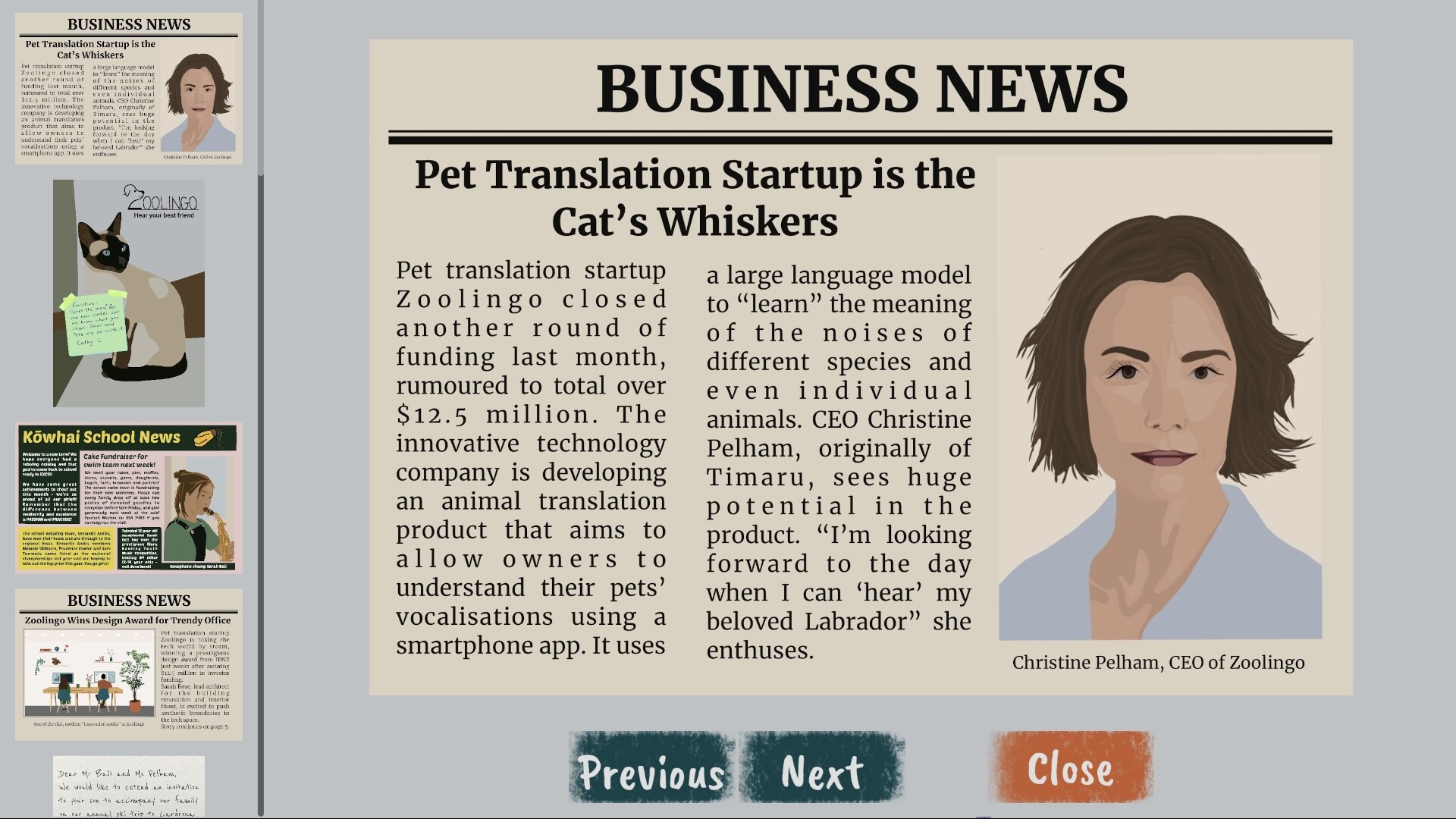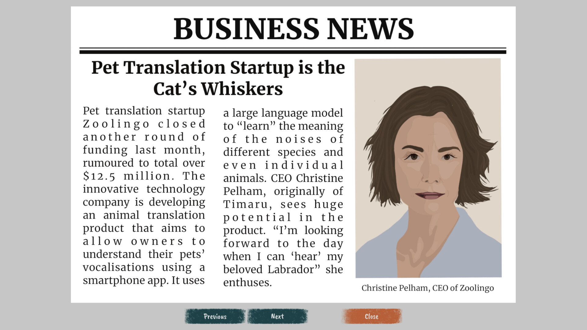 Zoolingo is a seemingly thriving startup which is building a pet translation app. After landing a massive round of investor funding, its CEO has vanished. Only a few documents have escaped the shredder. Your job is to meticulously read through every piece of paper.