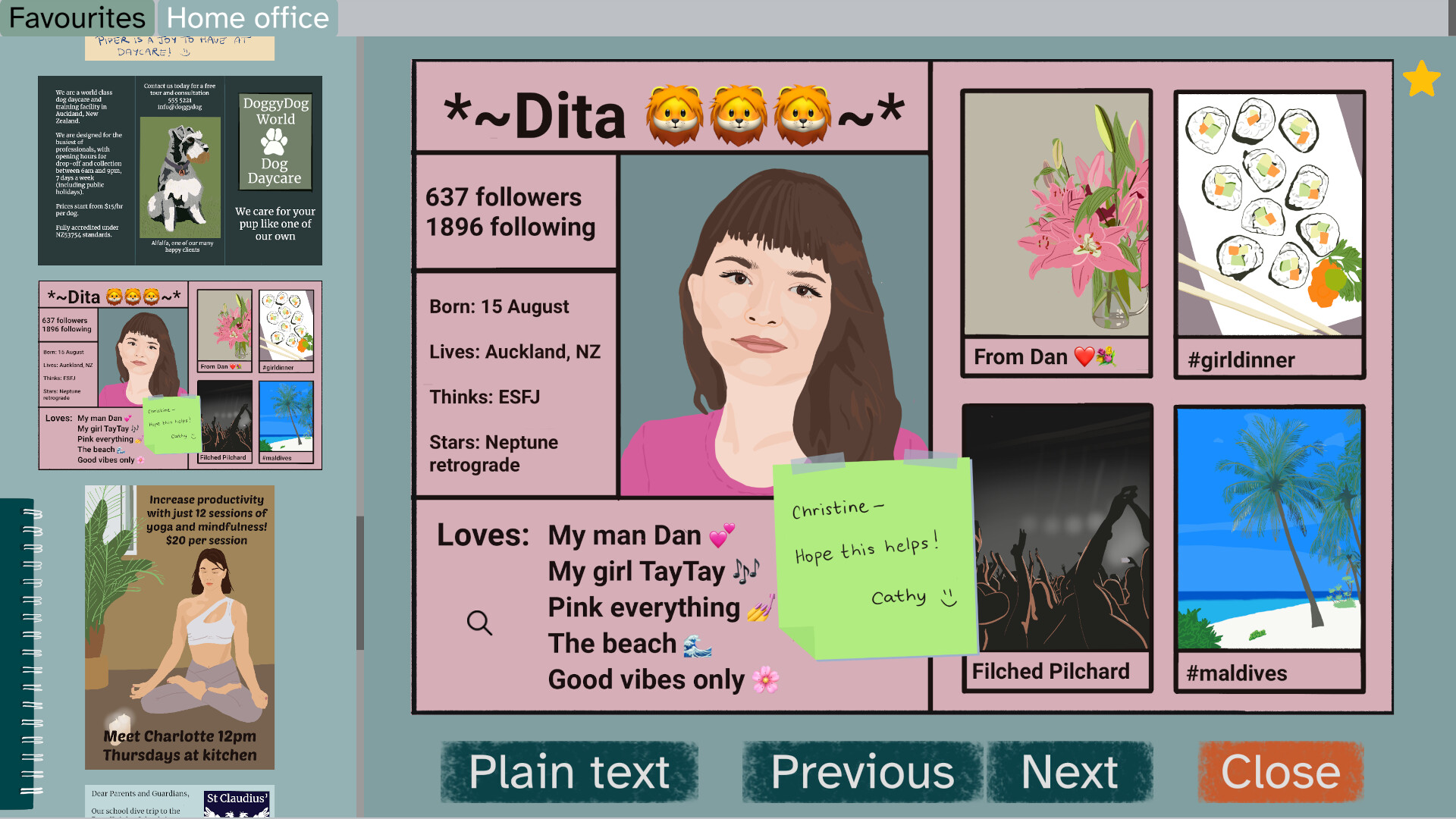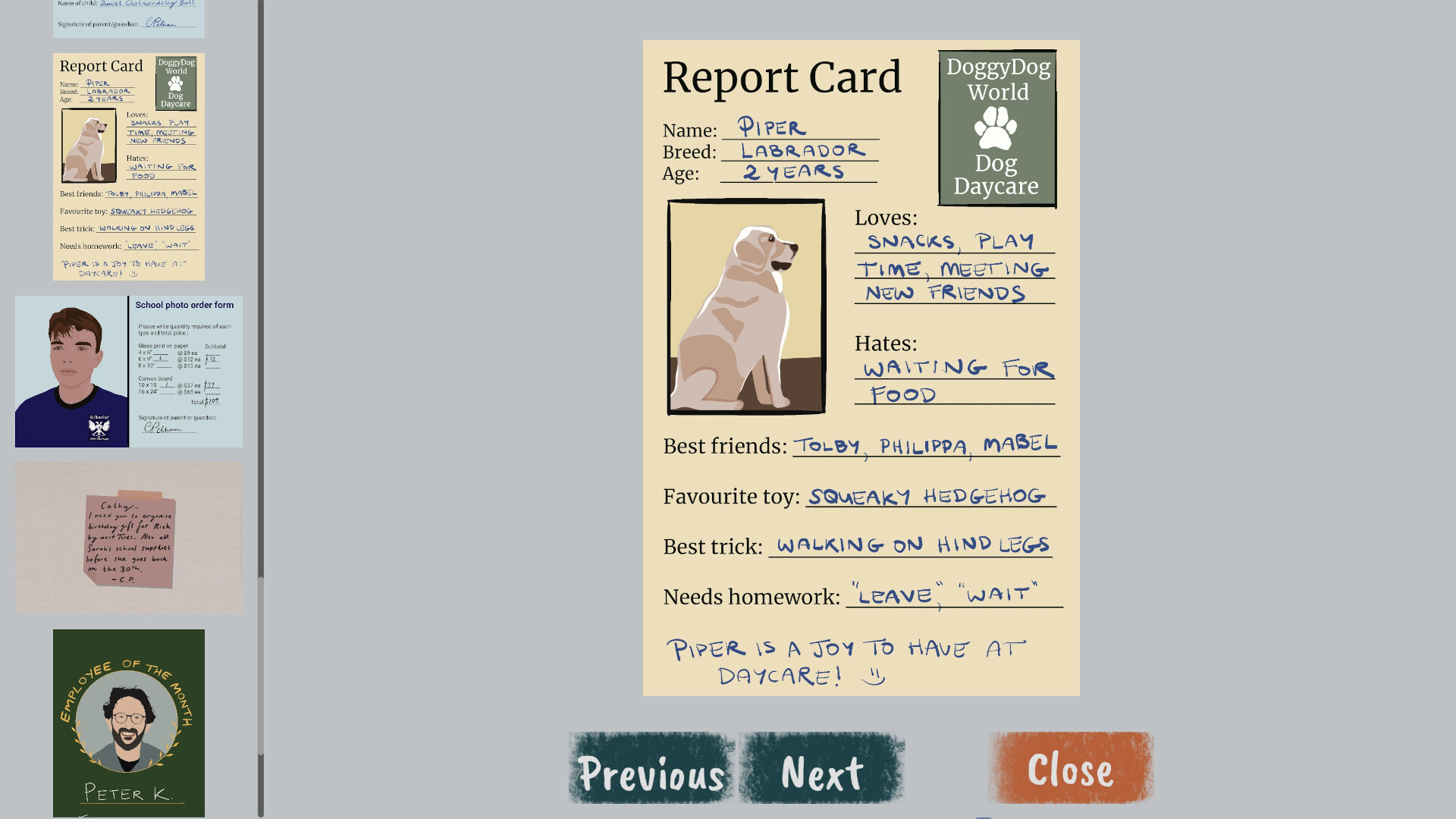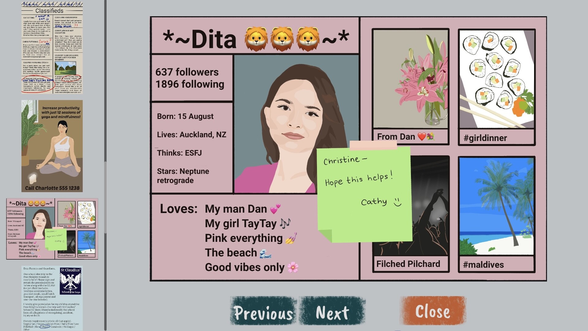 Deep reading: There is no searching or hunting for hidden clues. All documents are provided throughout the game, and the puzzle is in how you interpret them. Each insight is earned through close attention and logical reasoning.