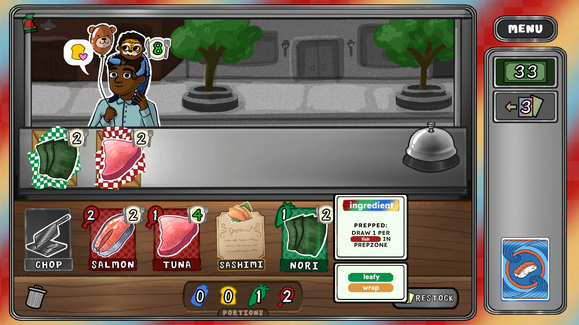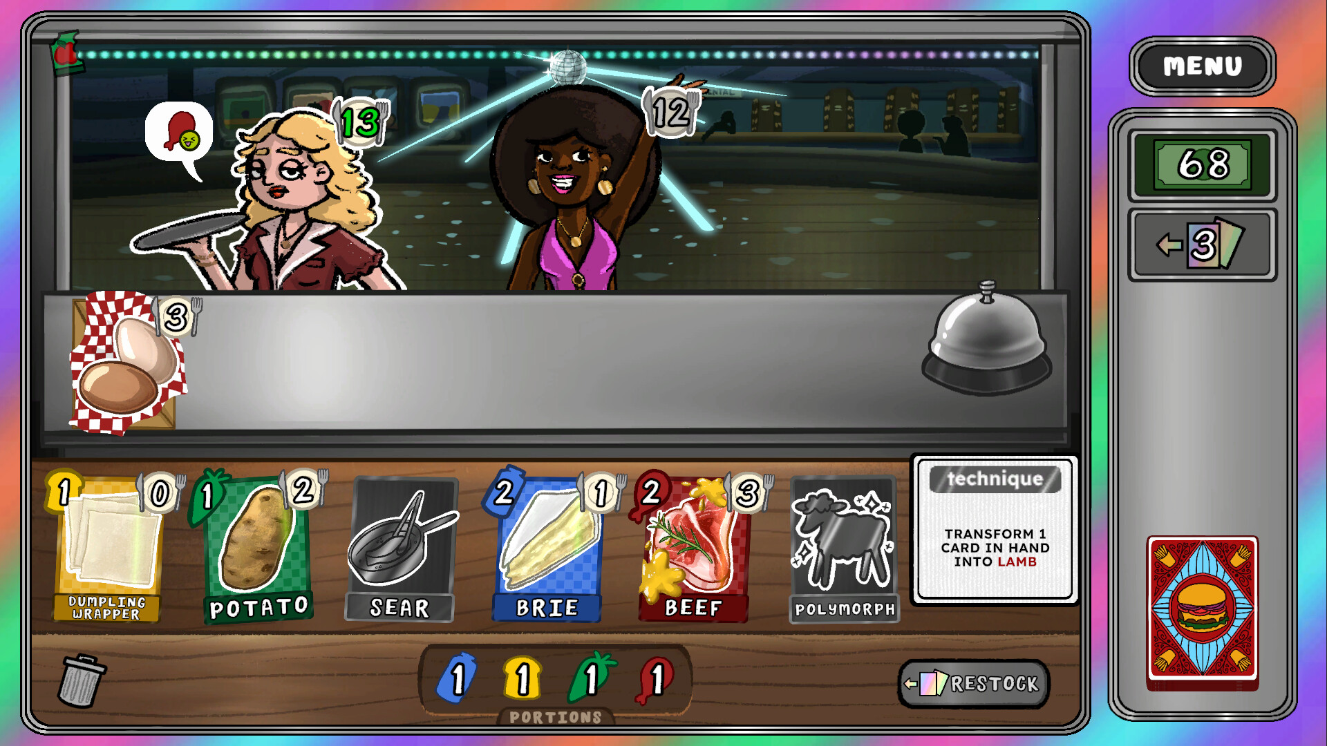 But it won't be enough to just make a really big burger. Zany bosses bring self-contained puzzles to navigate, testing your deck's flexibility. They'll slip you a card and refuse to leave until you serve it to them or clog the window with half-eaten scrap. You'd better be able to improvise.