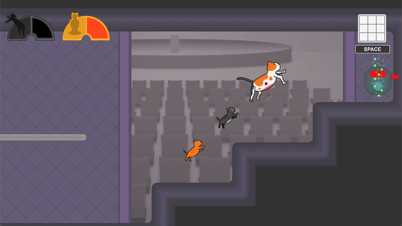 A Simple Expurriment is a combat-free metroidvania where stealth is key - no big deal for a cat, specially the three kittens that were genetically upgraded to jump higher, become undetectable and so on. But that's not enough when all the security systems are after the elusive cat mom: that's why she also gets the ability to manipulate sections of the building like pieces of a sliding puzzle, allowing her to move through the depths of the Research Area, the perils of the Maintenance Area, the exclusive VIP Area and the scariest place in the galaxy - the corporate cafeteria.