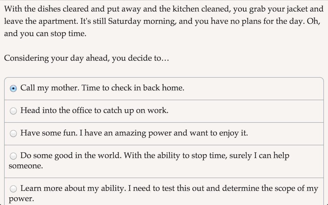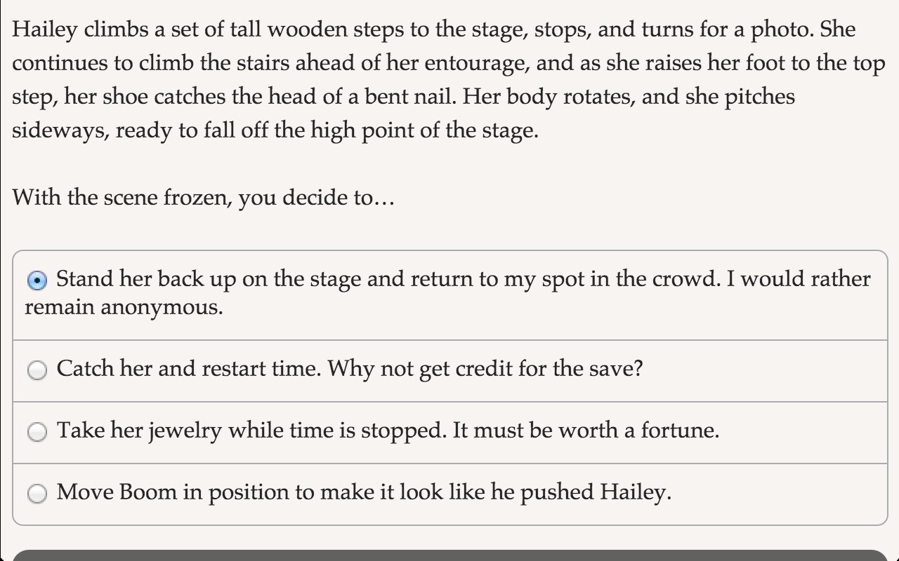 With the power to freeze time, you can ransack a casino, rescue a celebrity, or cheat death itself! A thrilling interactive sci-fi novel.