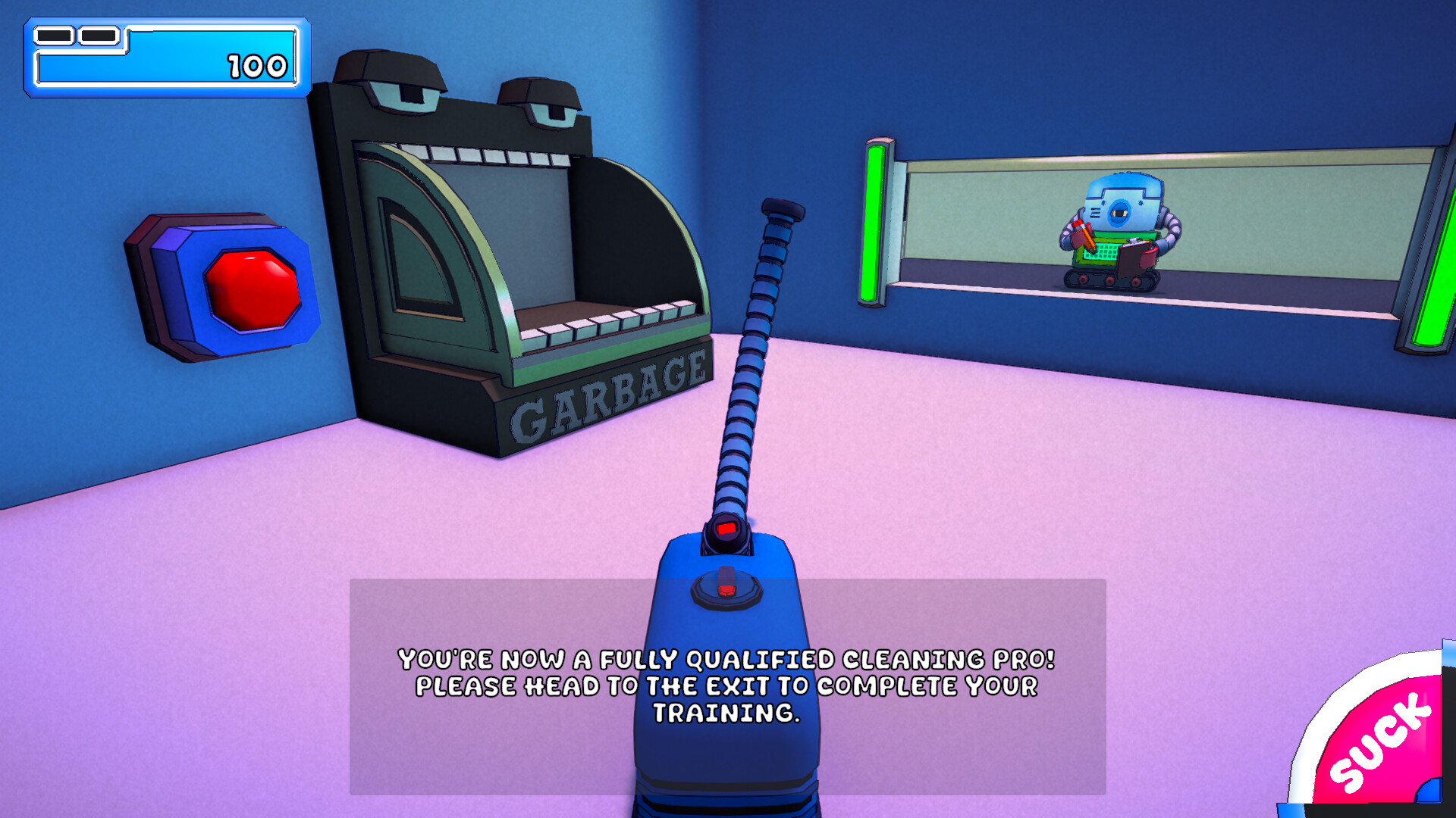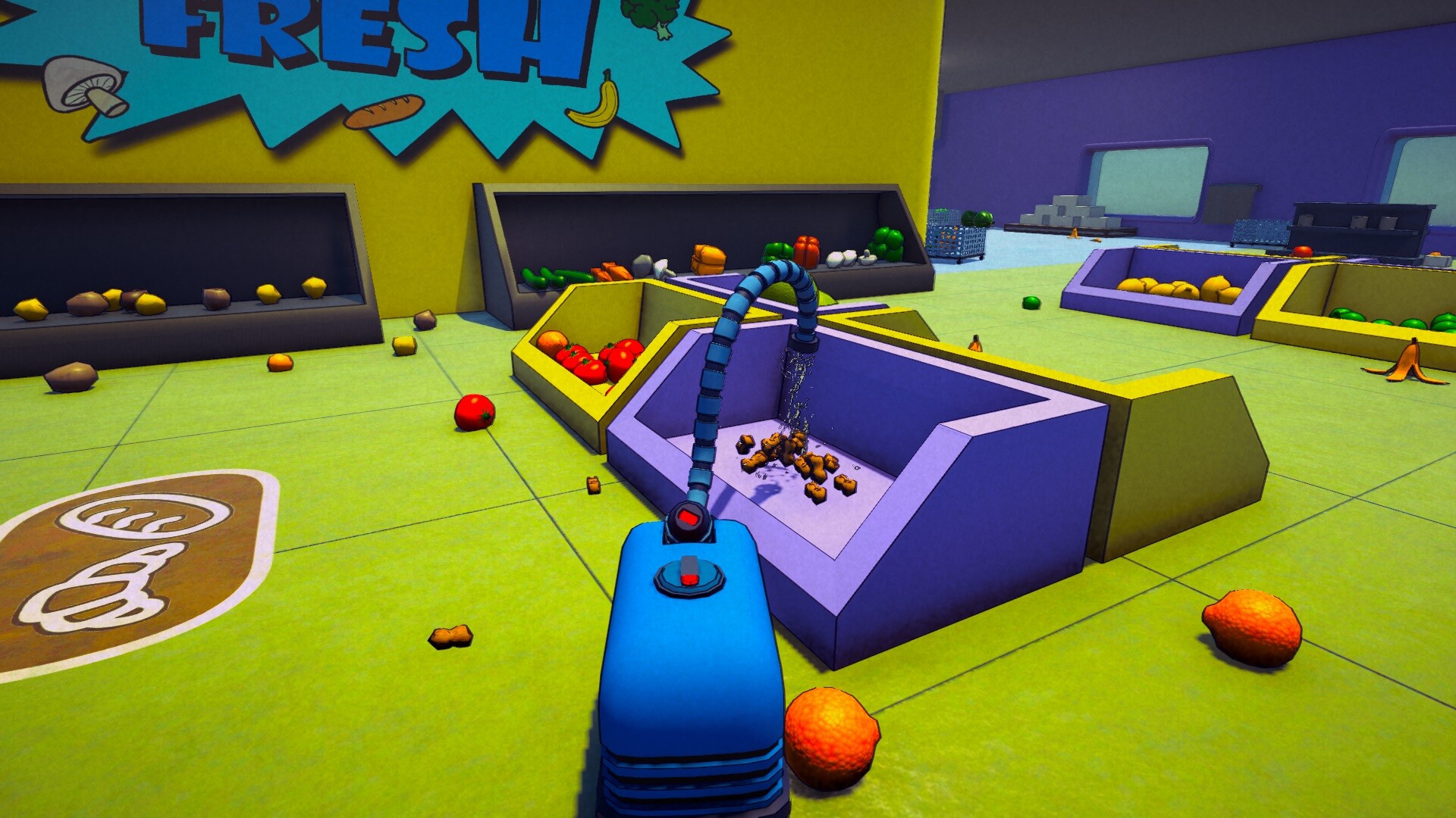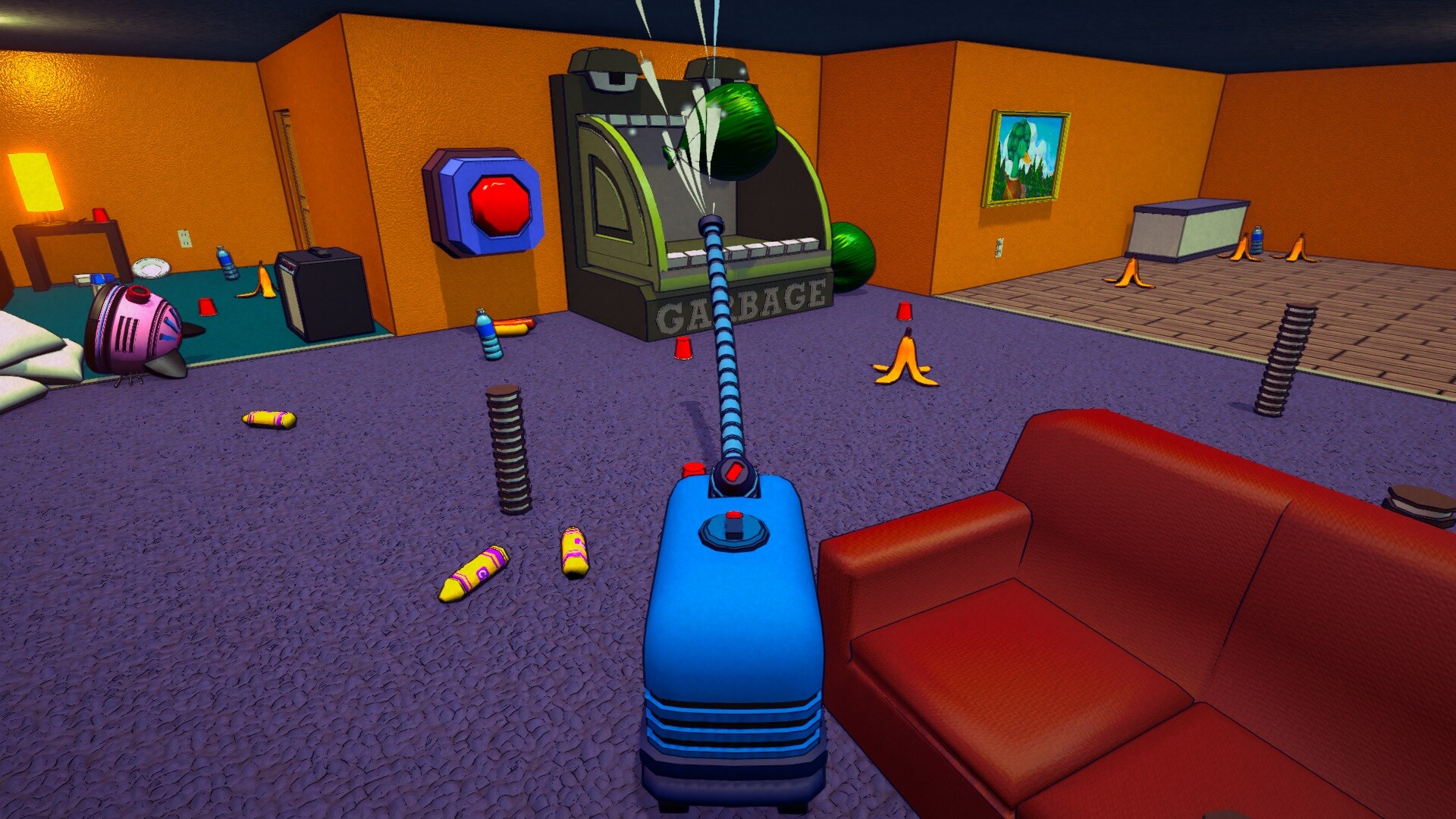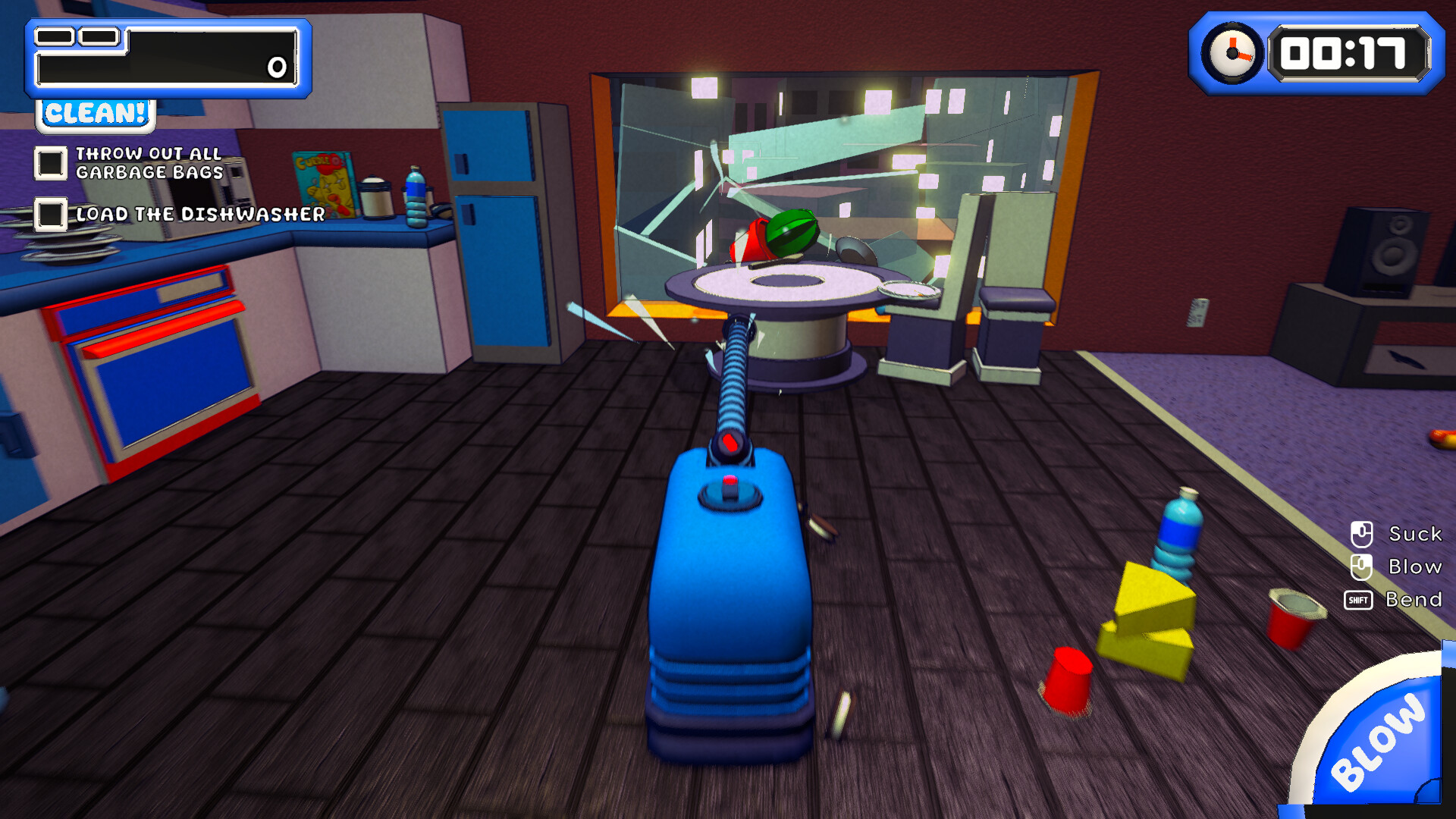 Vacuum trash, smash objects, and overachieve by clearing every corner of the levels