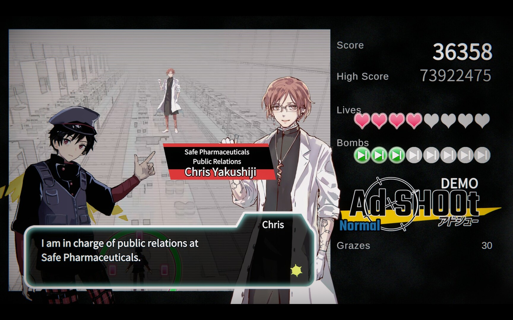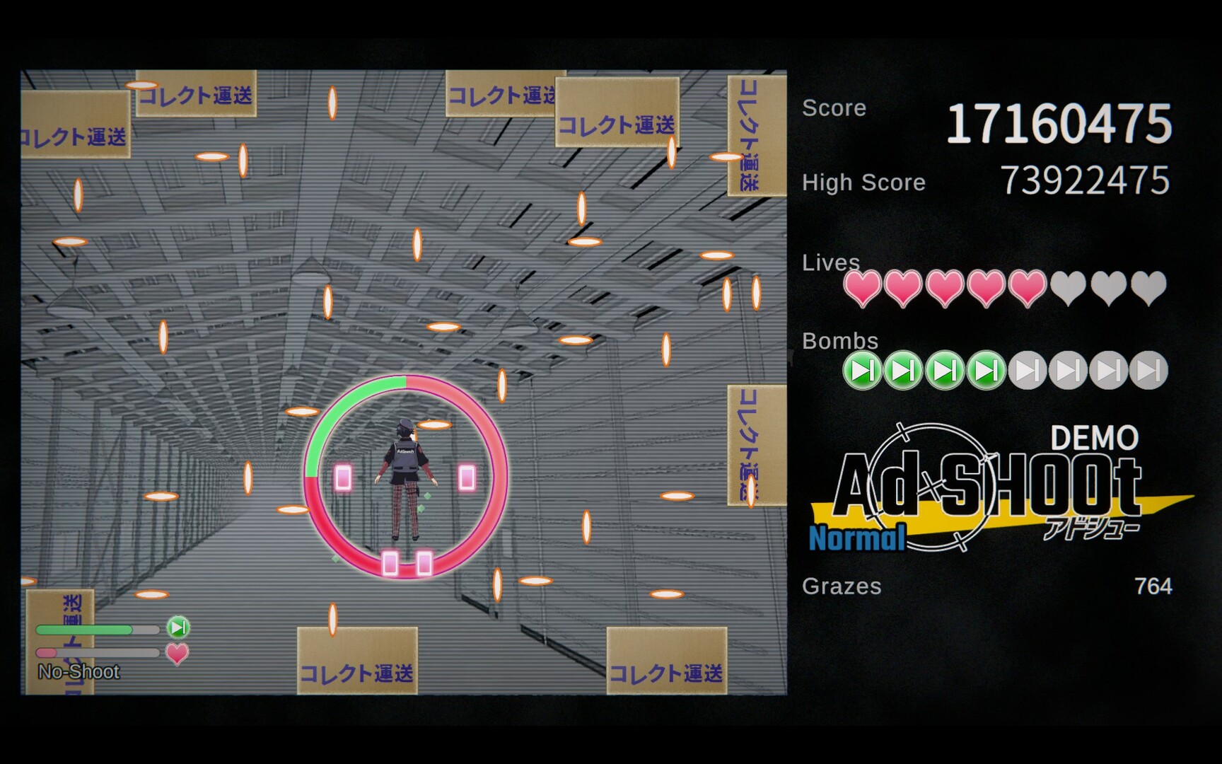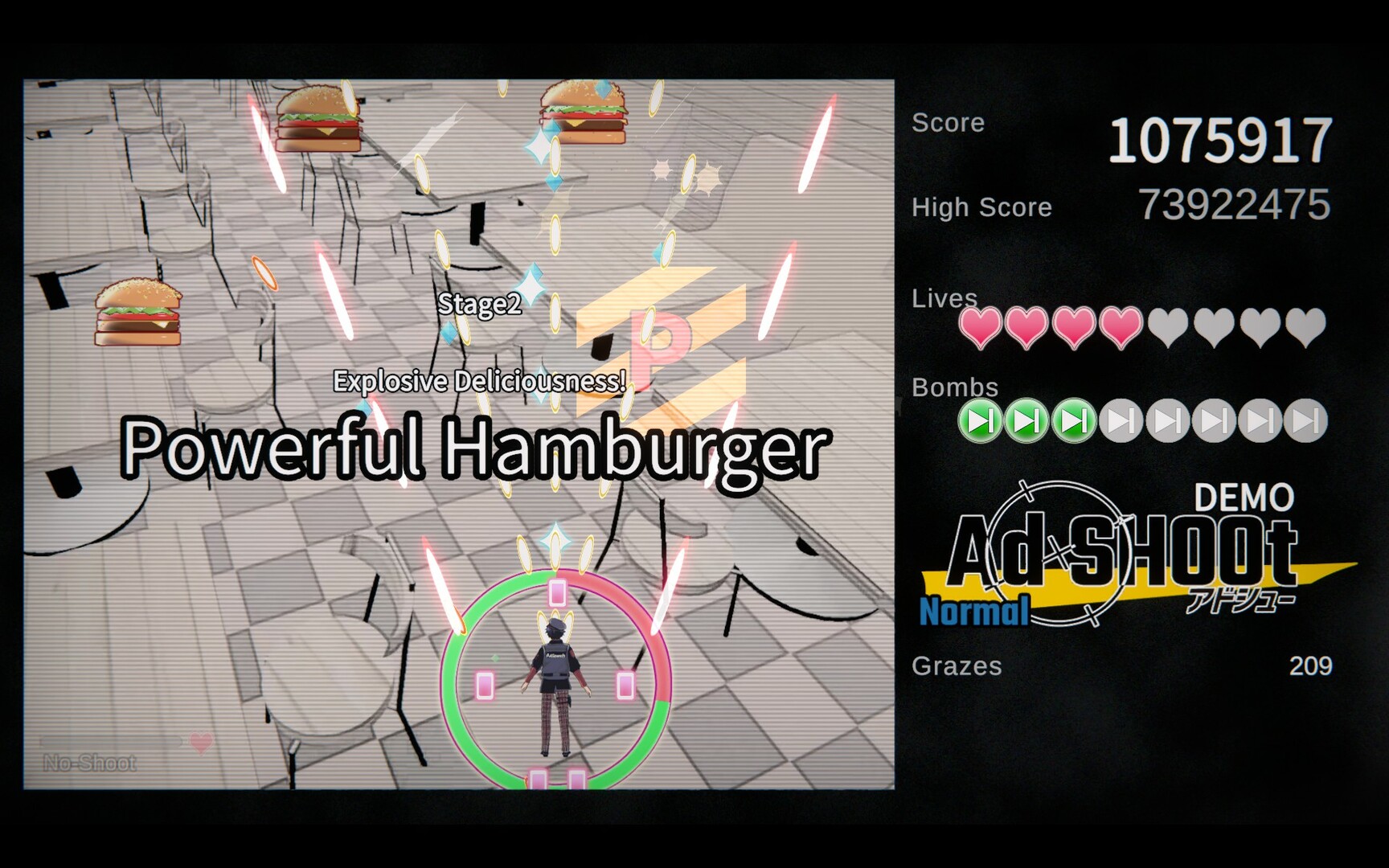 A 2D vertical scrolling bullet-hell shooter game(SHMUP) where you shoot down fictional advertisements. The demo version allows you to play 3 of the 7 stages.
