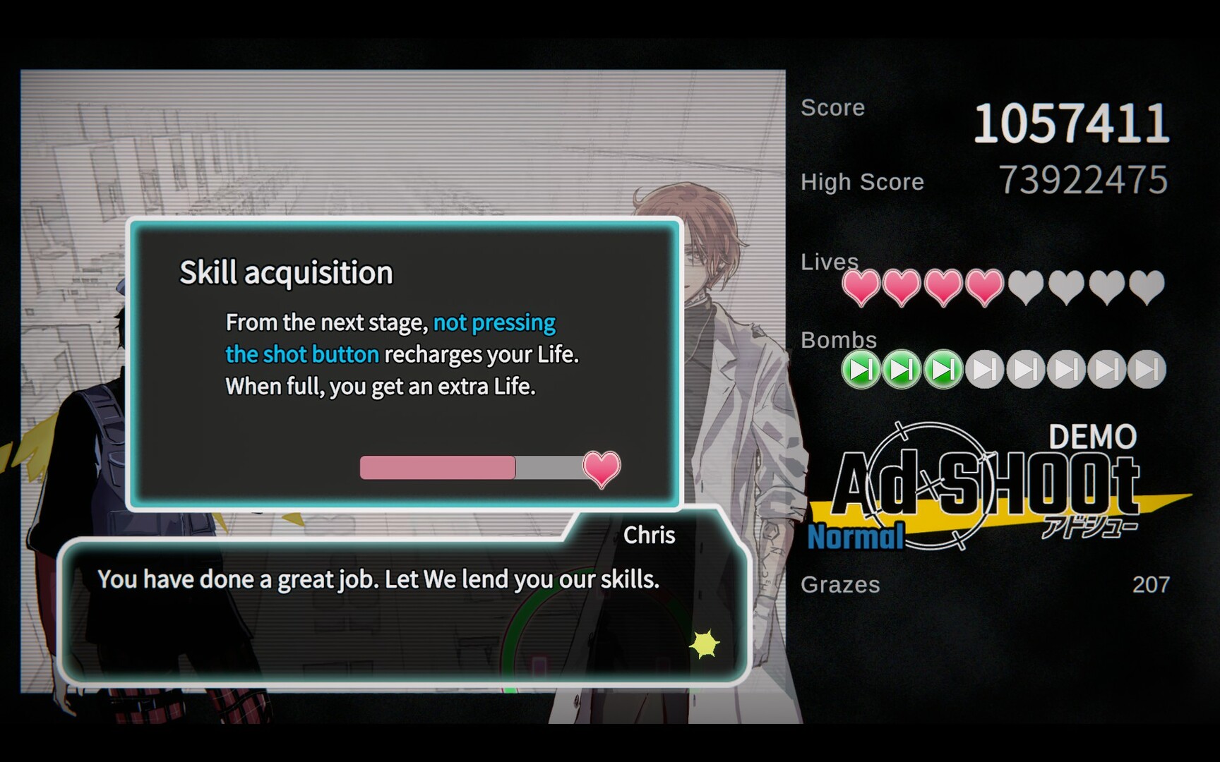 Defeating bosses earns you skills that can be used in subsequent stages. Not shooting down ads — pausing your shots — can also prove beneficial.