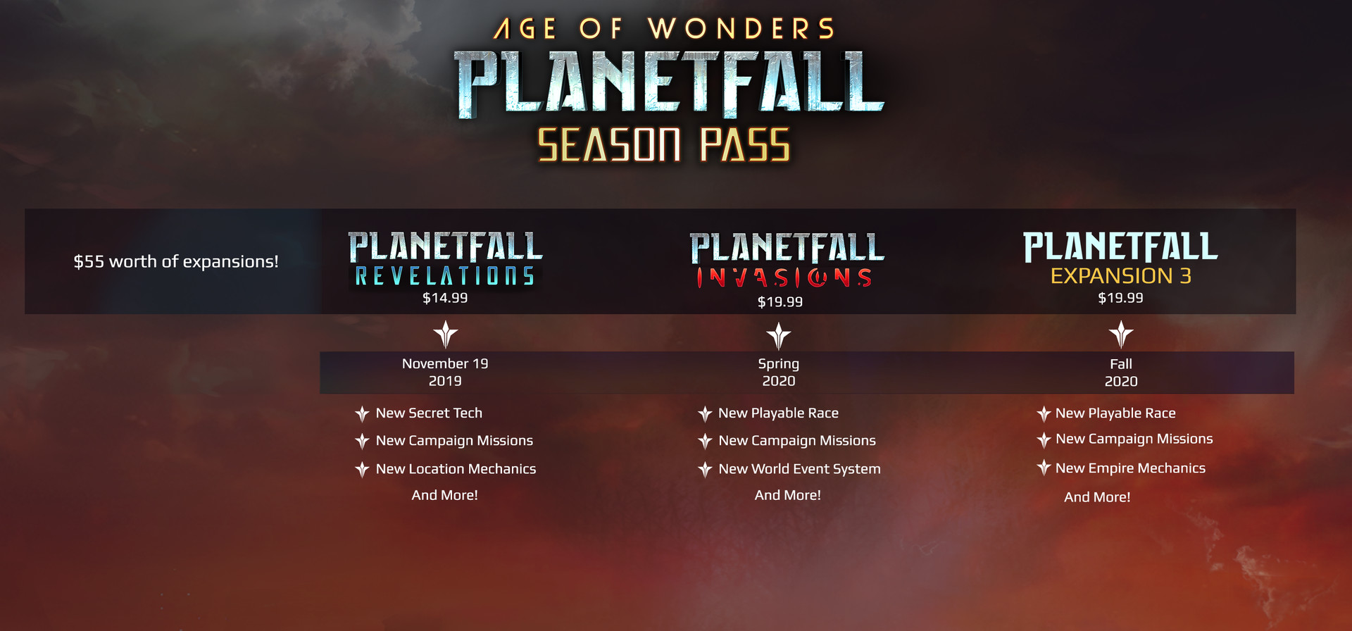 Build upon your existing empire with the Age of Wonders: Planetfall Season Pass. The Season Pass includes three upcoming expansions and an instant reward!