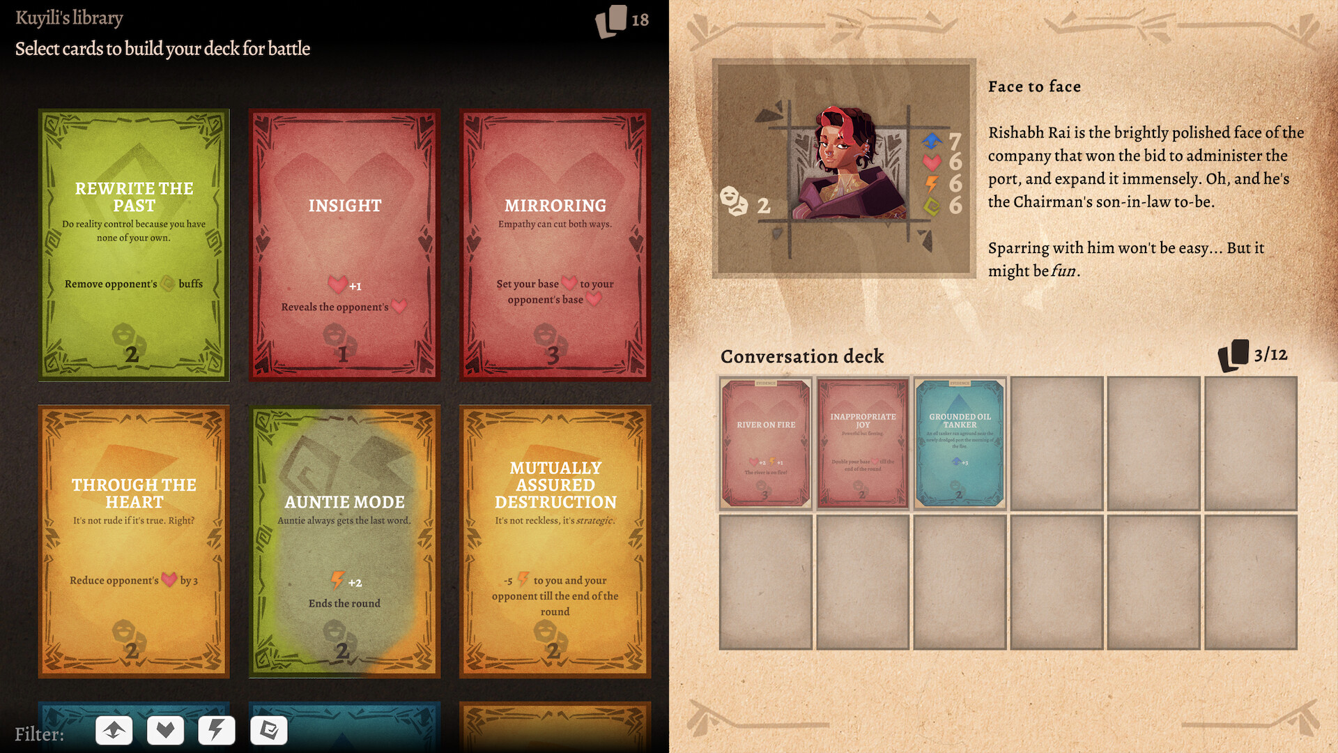 Conversations are courtroom-style strategic card battles. Charm and persuade, or intimidate and manipulate. Play cards to influence people’s emotional energies - Hearts, Minds and Guts. Engage their emotions, or exploit their vulnerabilities to make your points. Choose your strategy carefully, potential allies could easily turn into determined enemies.