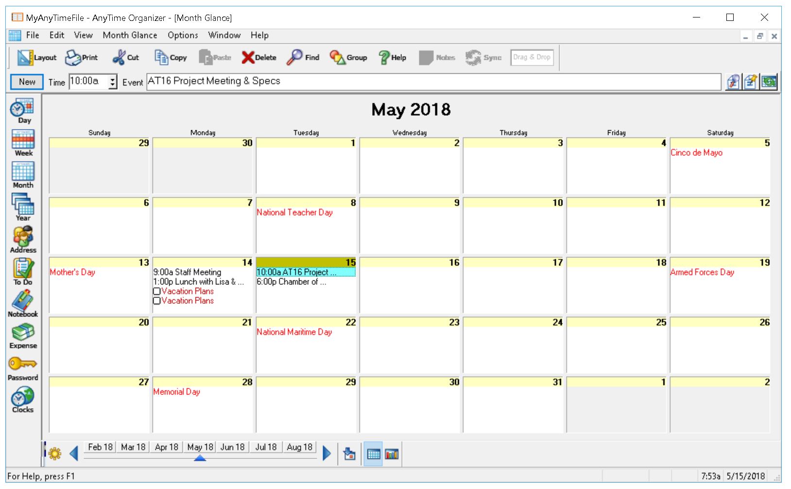 AnyTime Organizer has all the powerful tools you need to organize your personal and professional life! The friendly and simple interface makes it easy to access the Calendars, To-Do lists, Contacts, Notebooks, Passwords, Expenses, and hundreds of design combinations for printable calendars. Let AnyTime Organizer help you organize your life and you will see why more people choose AnyTime over any other brand of organizer software.