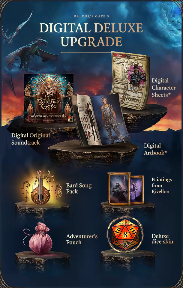- Digital Artbook - Explore the art and design of Baldur's Gate 3 in this comprehensive digital artbook, written by Larian.