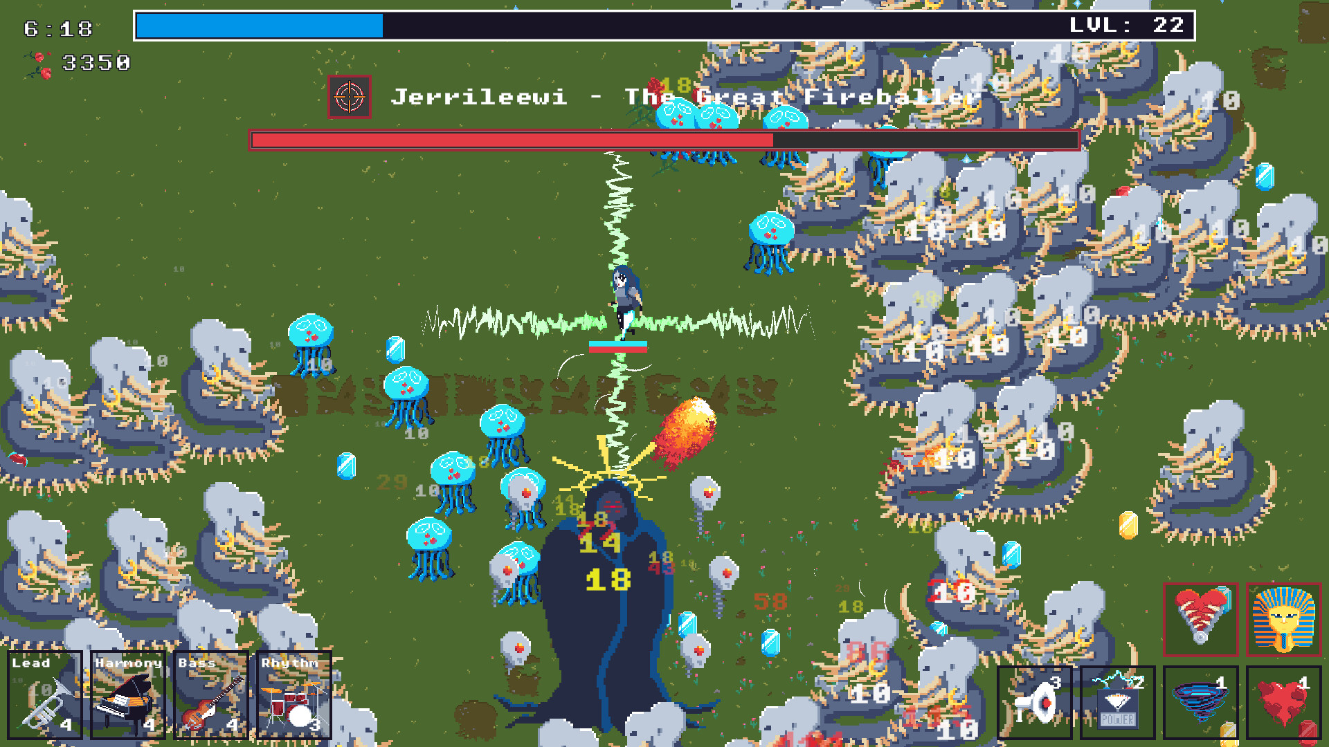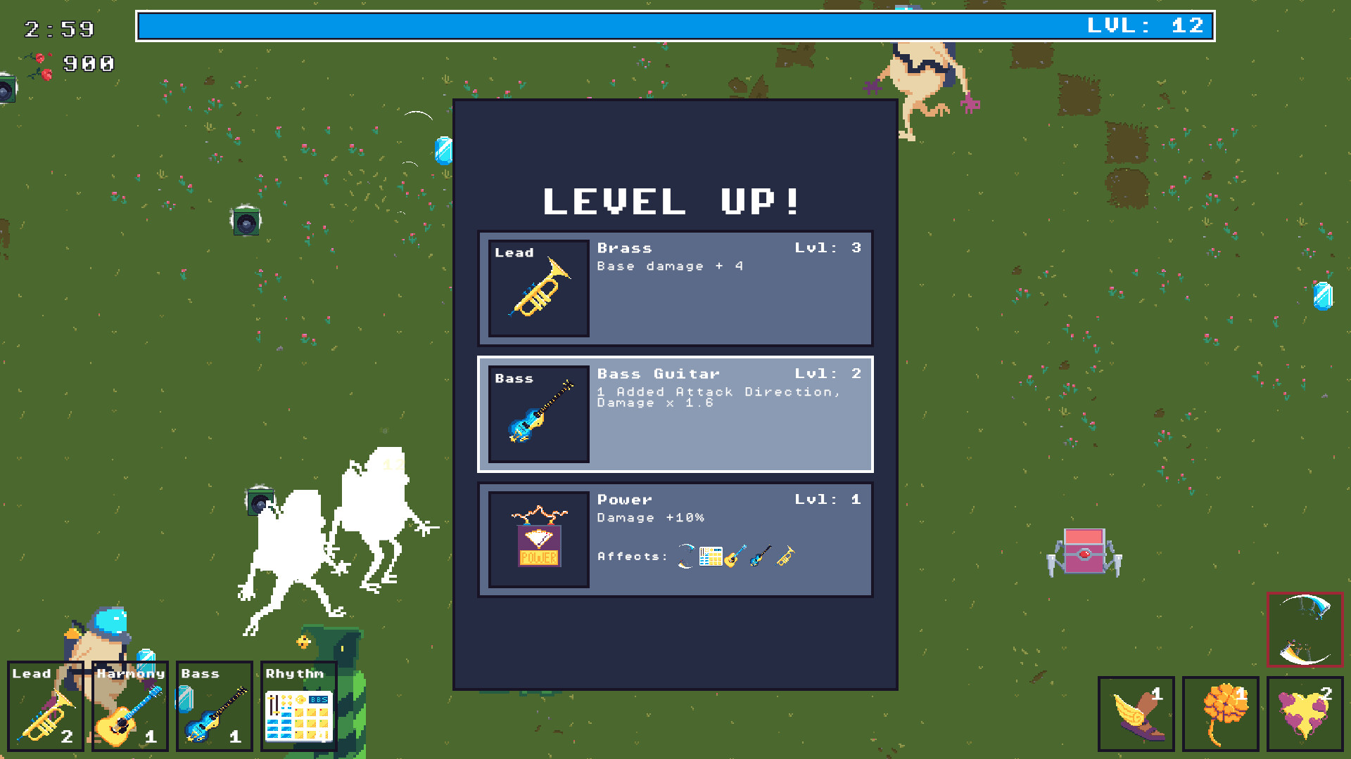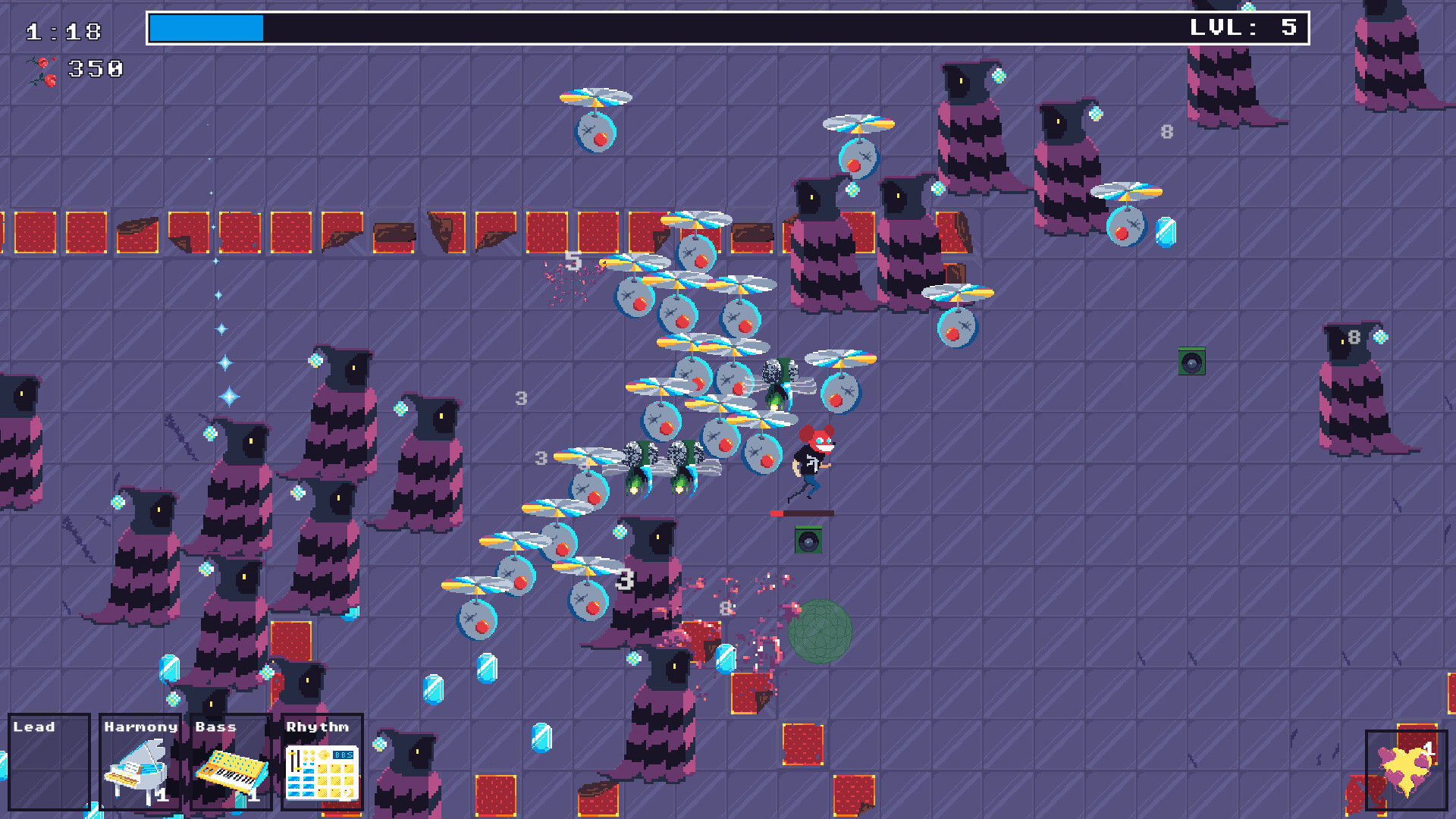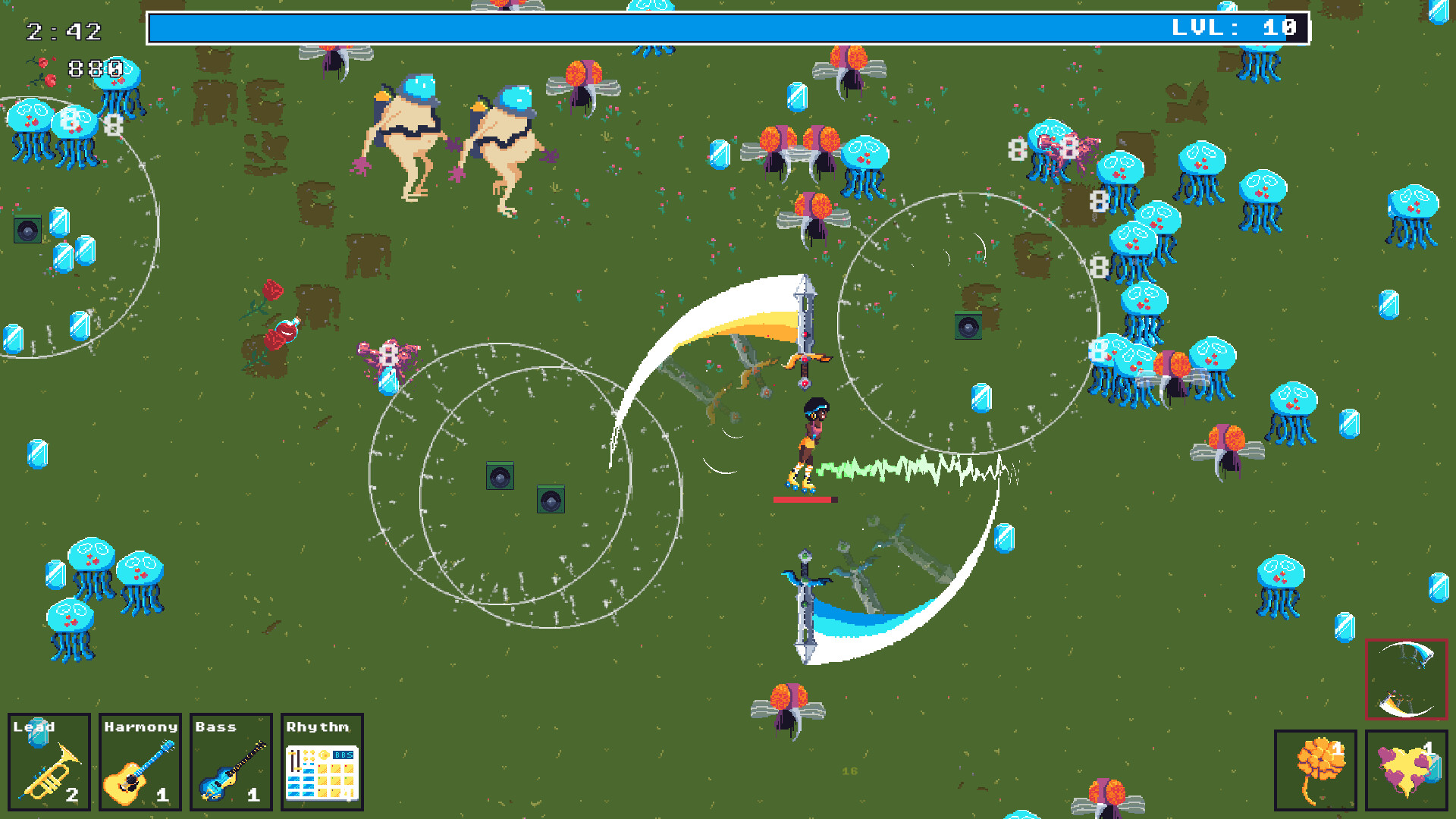 Fight the aliens, collect XP, level up your character. Doing so will let you upgrade or pick new instruments, improving your odds and attacks, but also affecting the music being played.