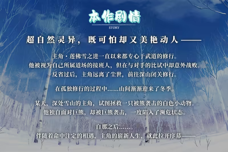 玩家将扮演在比武中惜败的武士,体验在深山修行的过程中,所发生的离奇且惊心动魄、却又感人至深的奇幻恋爱体验。