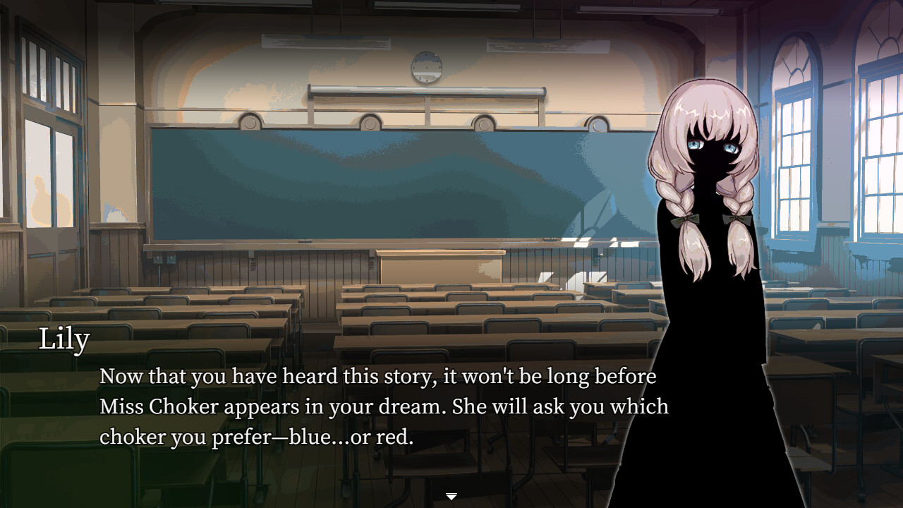 A horror game about a needy female ghost. A trio of close-knit occult club girls gather late at night to enjoy telling ghost stories. Little do they know that Miss Choker, a ghost that targets girls, is just dying to appear...