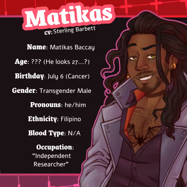 Why hello there, dark and handsome. Matikas is well liked by those who know him as he aims to please, but something about his sweet and confident personality seems suspicious, to say the least. Even if everyone else has fallen for his suave demeanor, surely Santiago won’t fall for it so easily. After all, life is never this simple.
