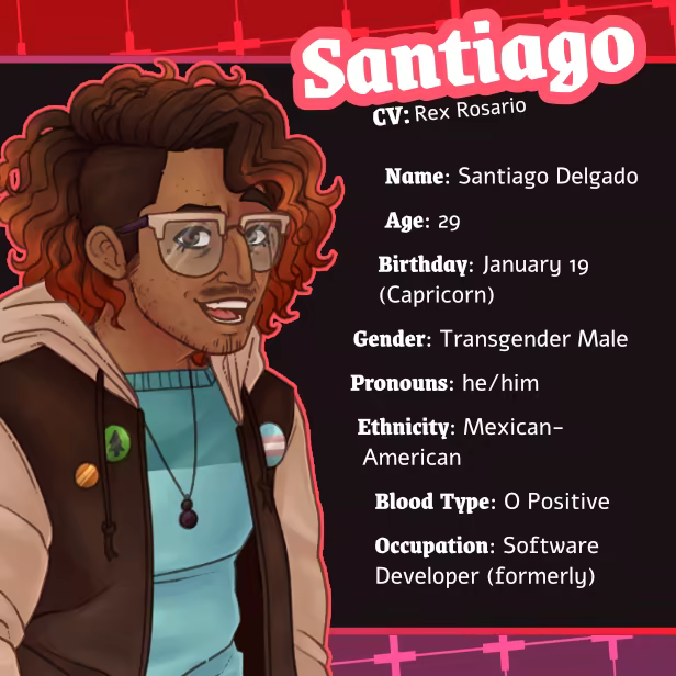Santiago is the textbook example of the classic burnt-out gifted child trope, spending a lifetime studying to enter a workforce that would deny him promotion opportunities at every turn. After a few unlucky incidents that left him in a little more debt than he’s willing to admit, the final nail on the coffin was getting laid off from his job one morning. He enjoys a good horror movie or book while talking to his trusted rubber duck, Sir Java the First, when he’s not full of anxiety.