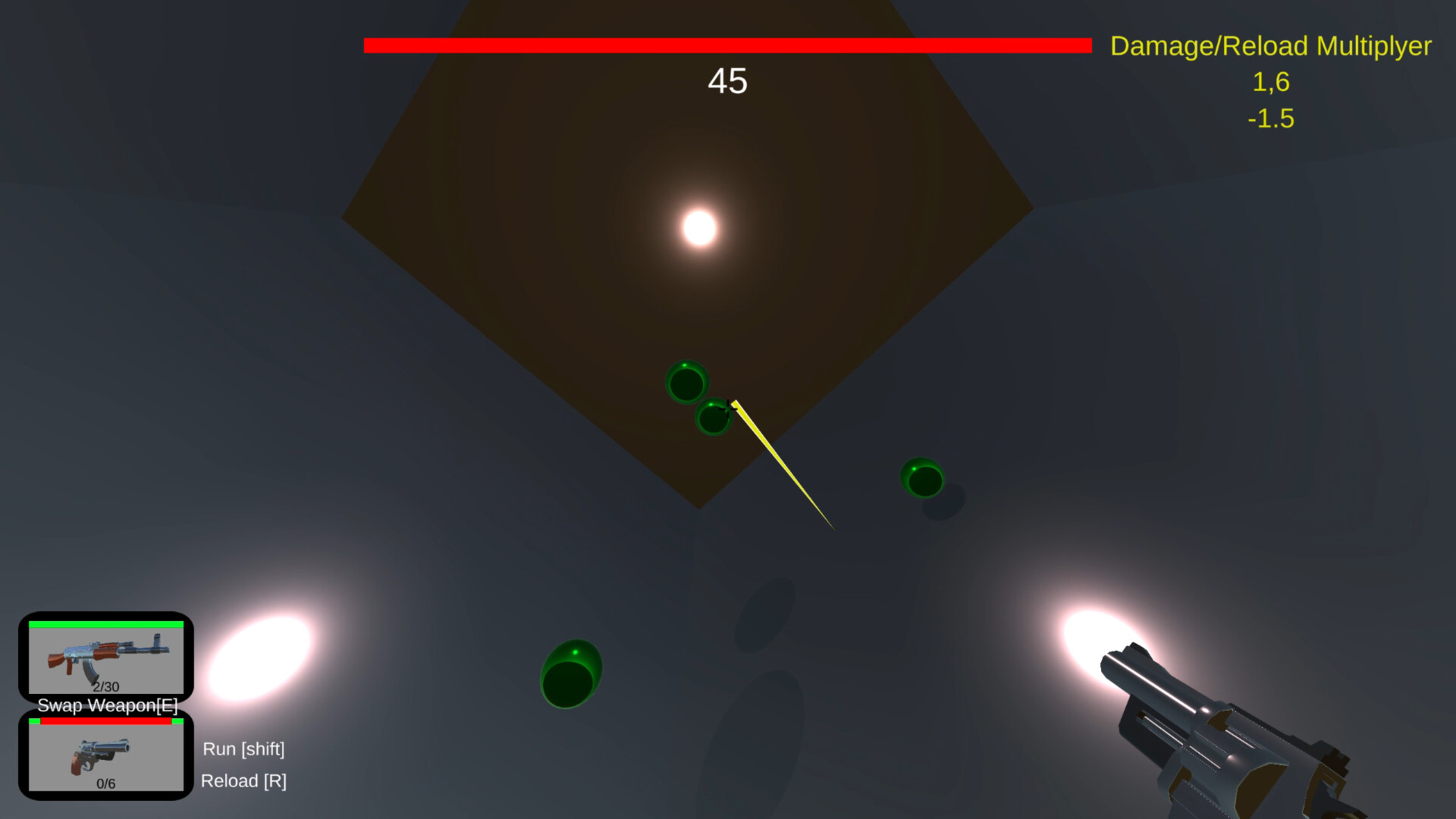 You will start with a weapon in a kind of training box with the sides slanted. Then balls fall from the sky that you have to hit, big balls that are easy to hit and small balls that are difficult to hit. Try to get as far as you can and don't let the balls hit you