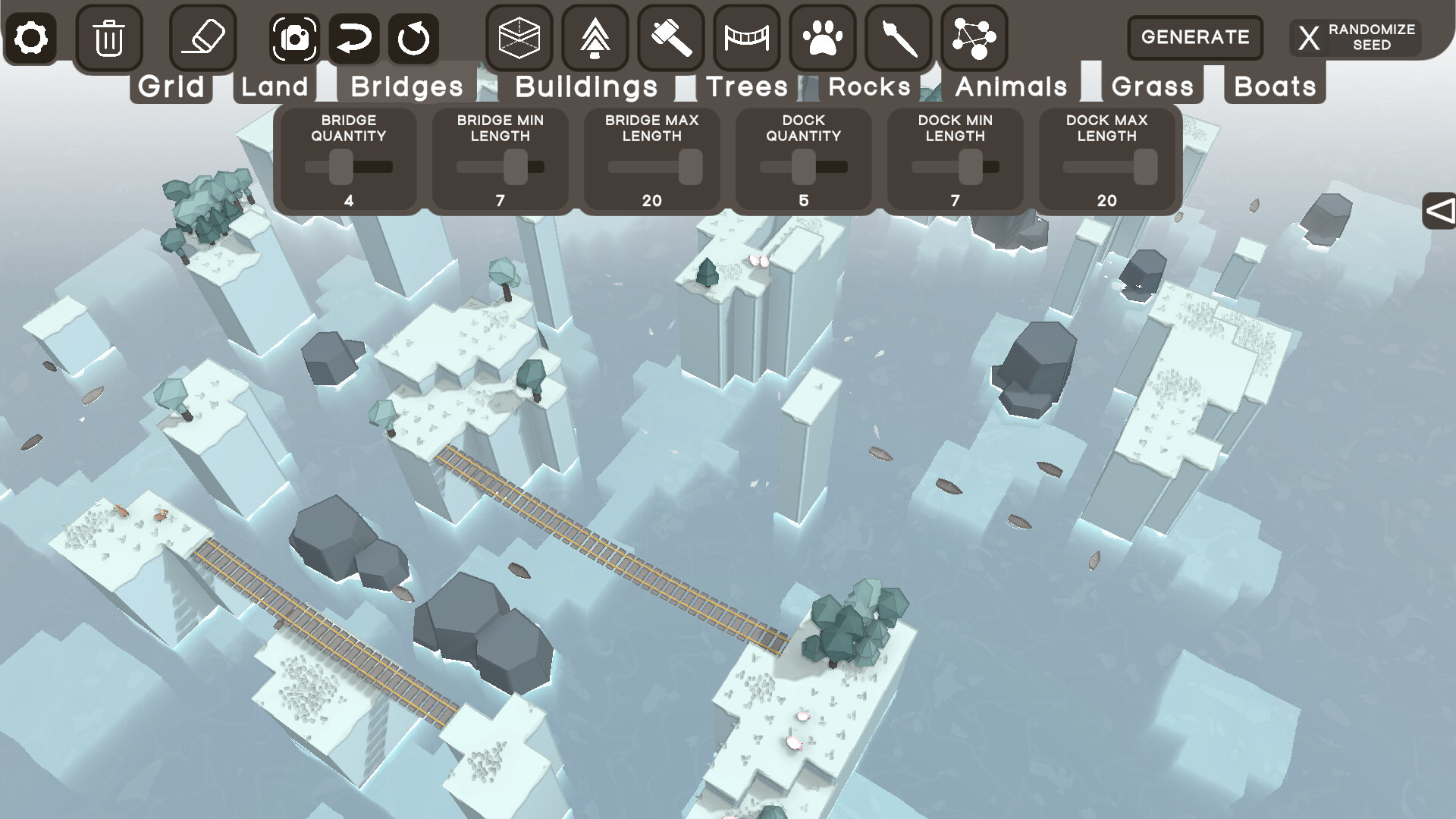 Create cozy islands while completing objectives to unlock new items & tools. Adjust the quantity of bridges, the maximum height of the terrain, and meticulously tweak configurations to create unique island worlds!