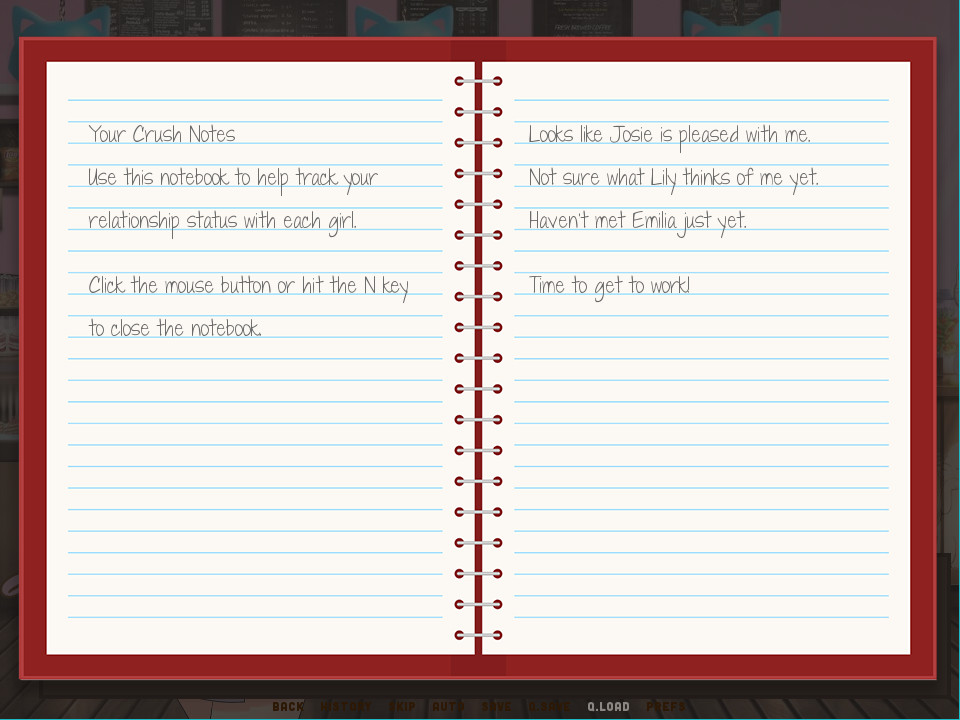 Playing video games and watching anime is all well and good - but what happens when you need money? You get a job!Presenting Café Crush, a short choice driven visual novel where you manage to land a part-time job working at Kitty Café, a quaint little coffee shop and bakery run by three cute girls, Lily the bubbly waitress, Josie the aloof barista and Emilia the shy pastry chef. Work your way through each day, completing mini-games and serving customers while chatting with each of your colleagues to try and win them over. Who knows, maybe at the end of the week you'll snag a date with your favourite girl.