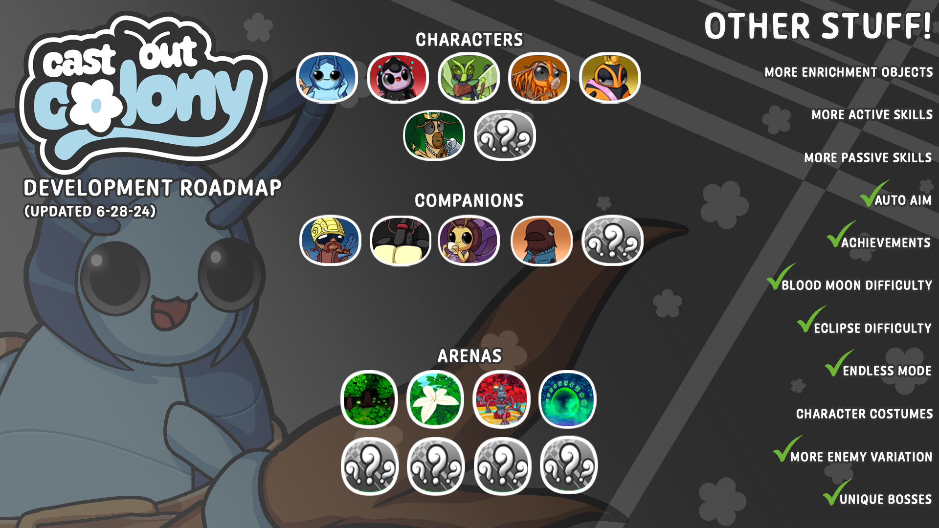 Cast Out Colony has been described by its players as a blend of Animal Crossing, Cult of the Lamb, and Vampire Survivors. It fuses roguelite gameplay, bullet-heaven action, and intricate town-building components to craft an entirely distinctive experience, redefining the survival genre. The meta-progression is located within the colony itself. The larger you grow your colony, the higher your character's stats become.