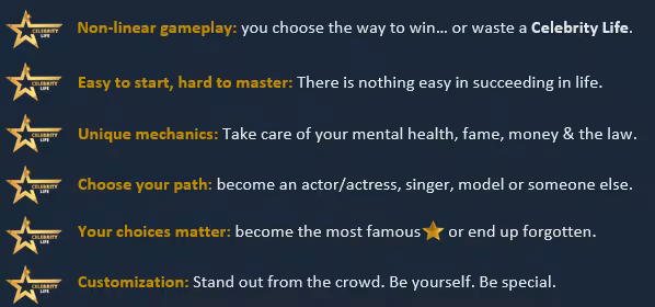 Happiness, success, fortune, fame, drama, scandals, and downfall. In Celebrity Life you'll experience them all. Take a journey through an immersive reflection of the peoples' lives we follow & talk about. The Celebrities! Now at last you can become one. Don't dream your life, live your dream.