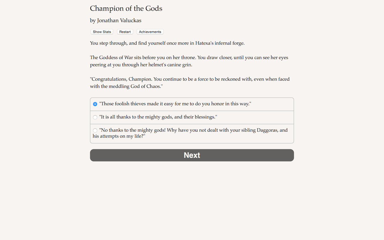 "Champion of the Gods" is a thrilling 217,000-word interactive novel by Jonathan Valuckas, where your choices control the story. It's entirely text-based--without graphics or sound effects--and fueled by the vast, unstoppable power of your imagination.