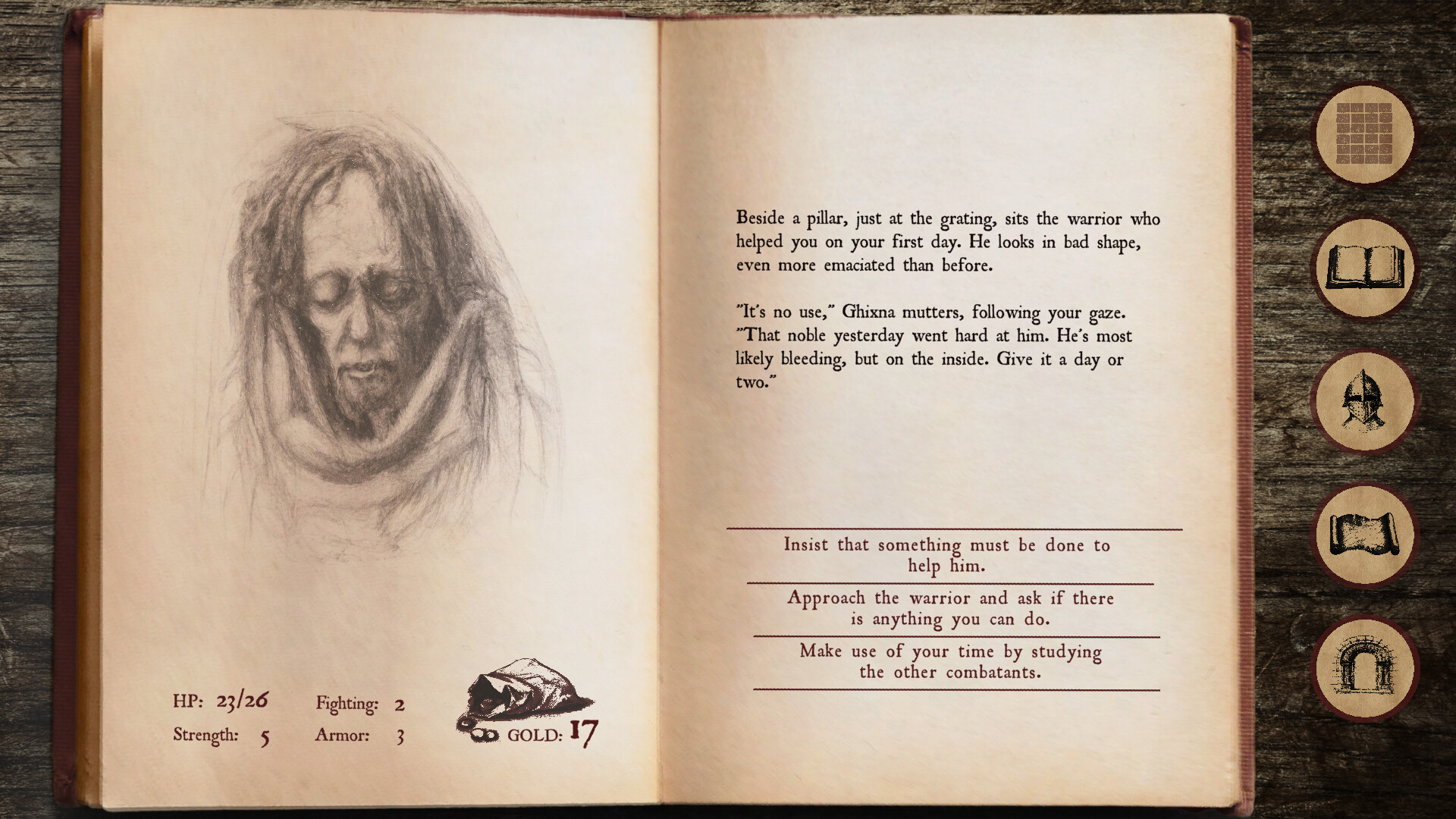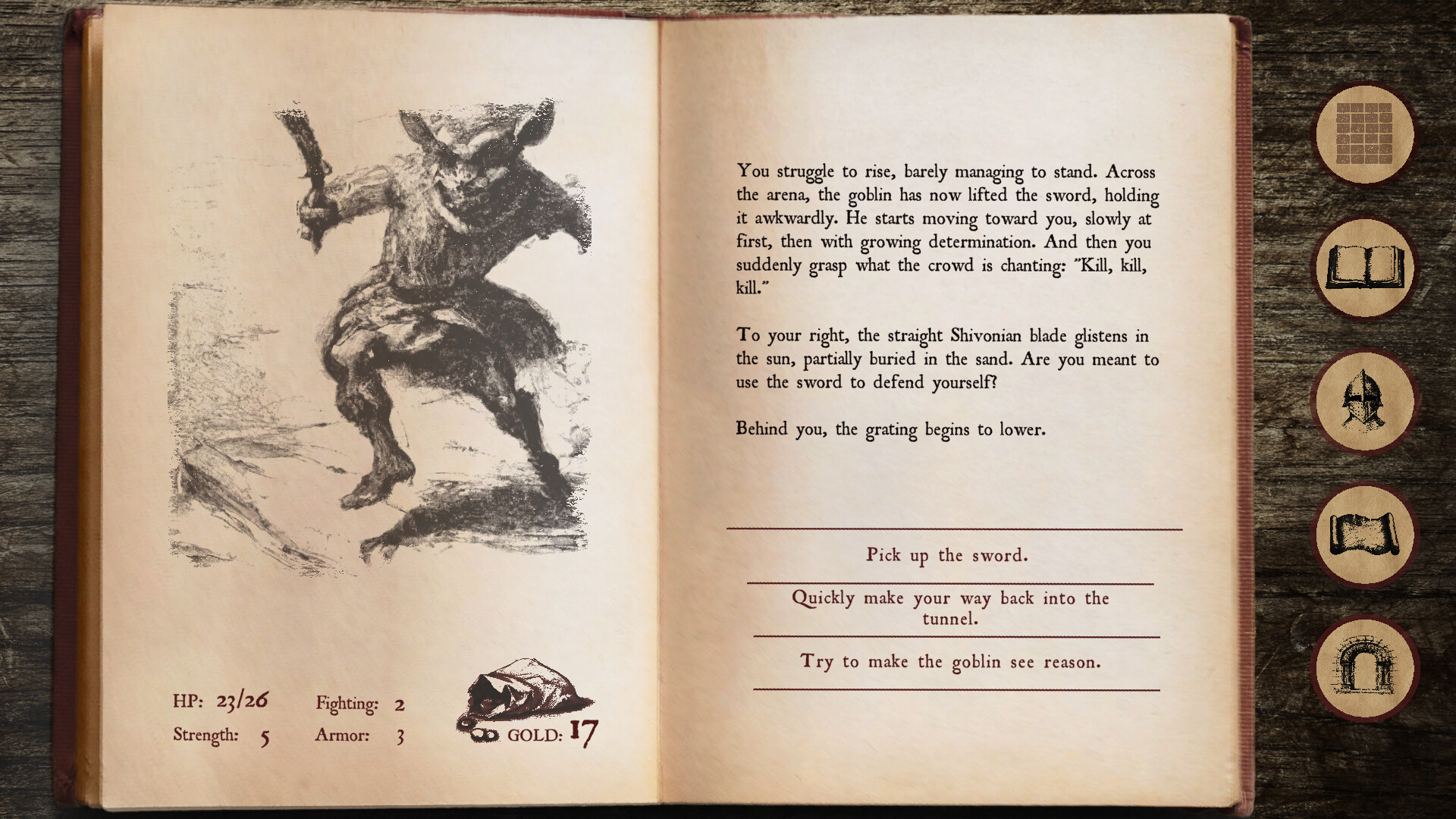 Detailed, gritty text-based fantasy RPG centered on realistic gladiatorial combat. Recreates the gameplay of the old gamebooks. Hassle-free inventory management and a battle system that combines dice rolls with tactical decisions.