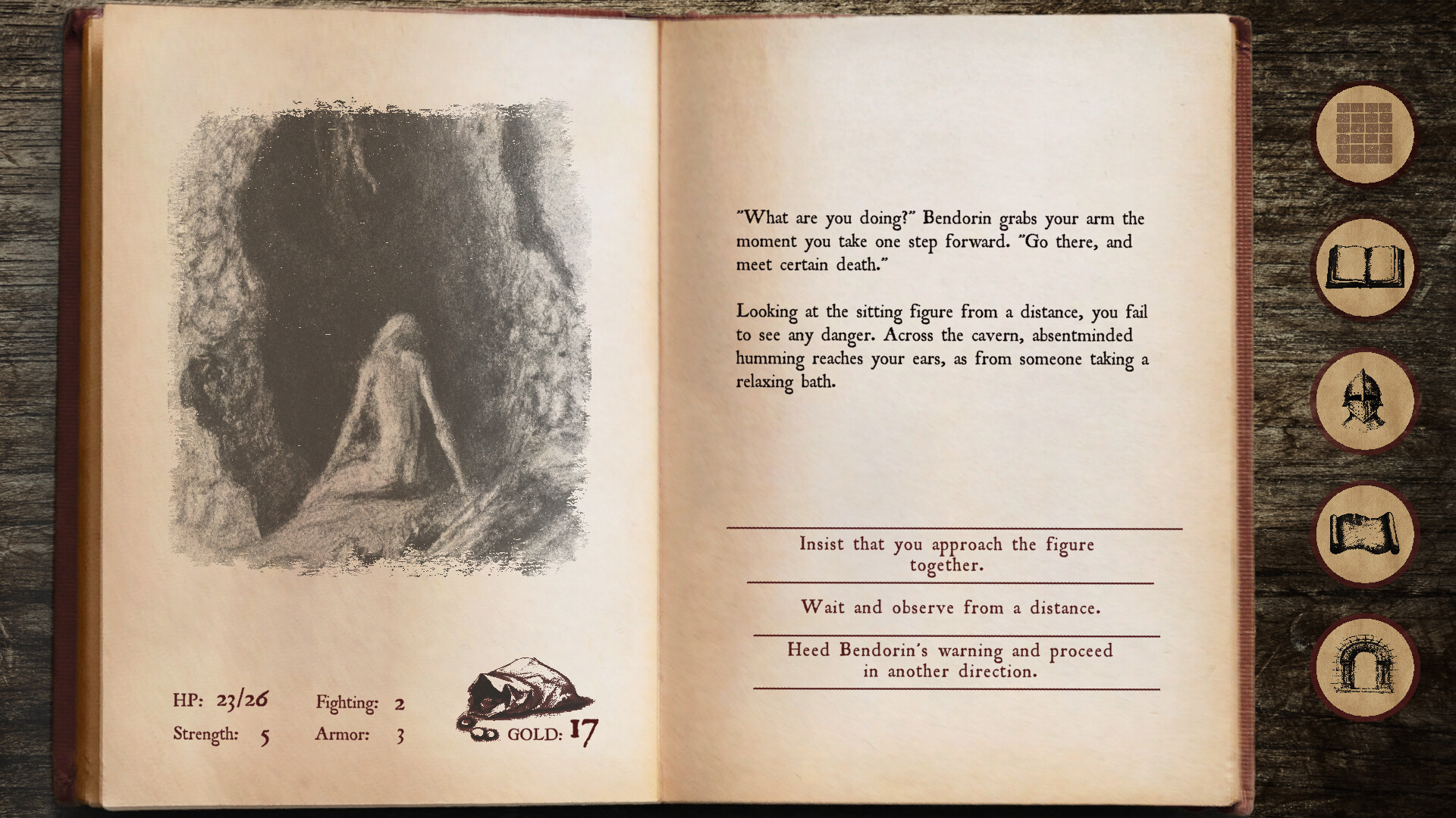 The fighting system is turn-based, like everything else in the game. Despite using dice rolls in the style of old gamebooks, all battles are wholly scripted and very detailed, offering ample room for tactics.