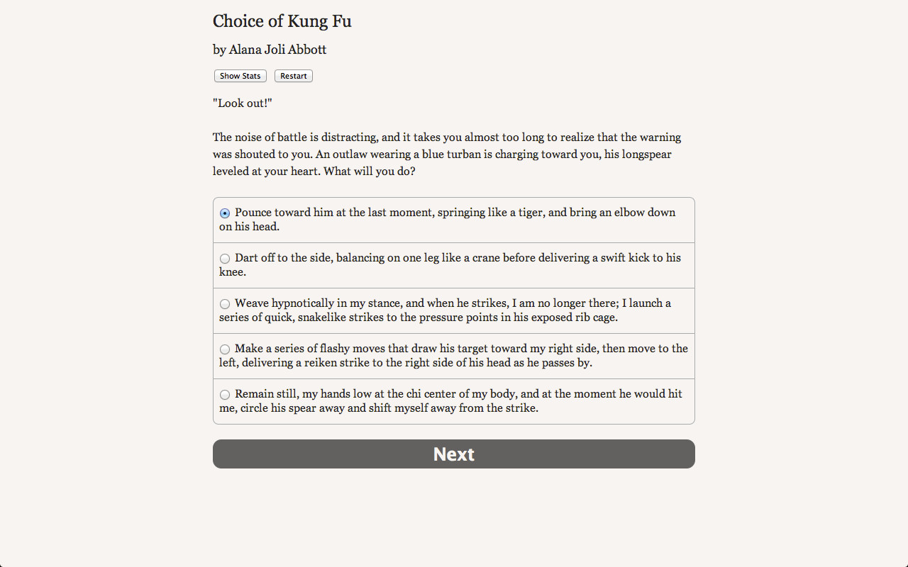 Choice of Kung Fu is a fast-paced interactive fantasy novel where your choices determine how the story proceeds. The game is entirely text-based—without graphics or sound effects—but powered by the vast, unstoppable power of your imagination.