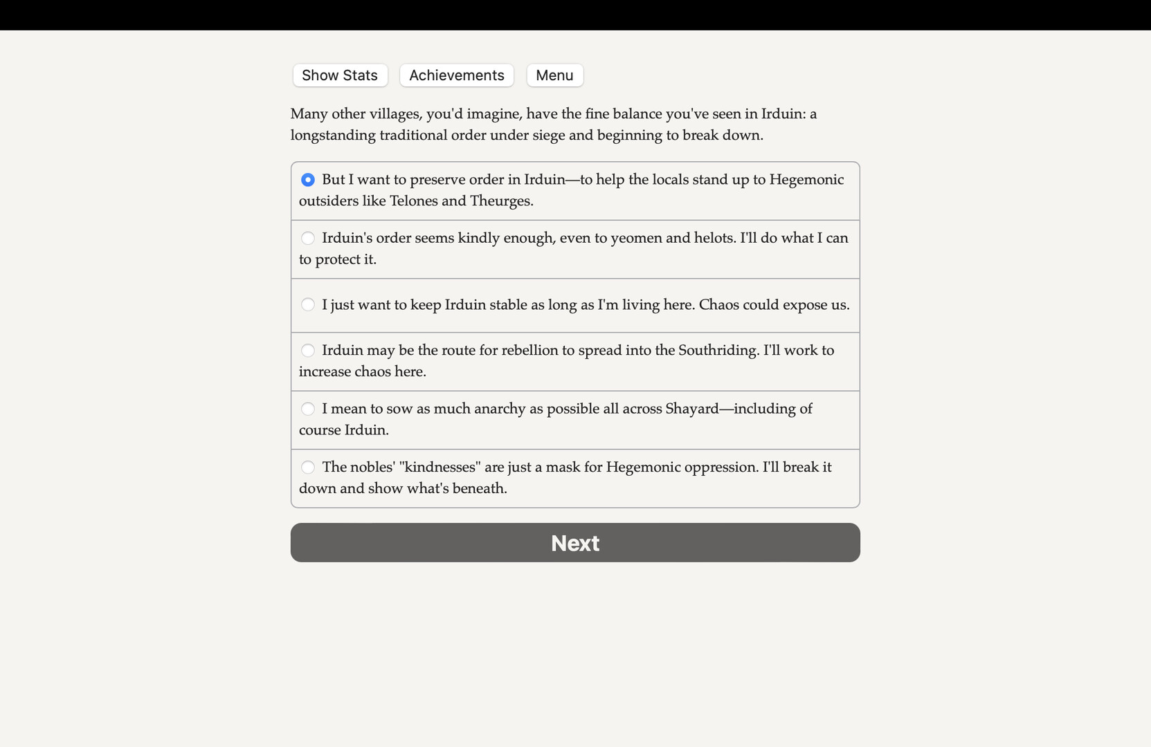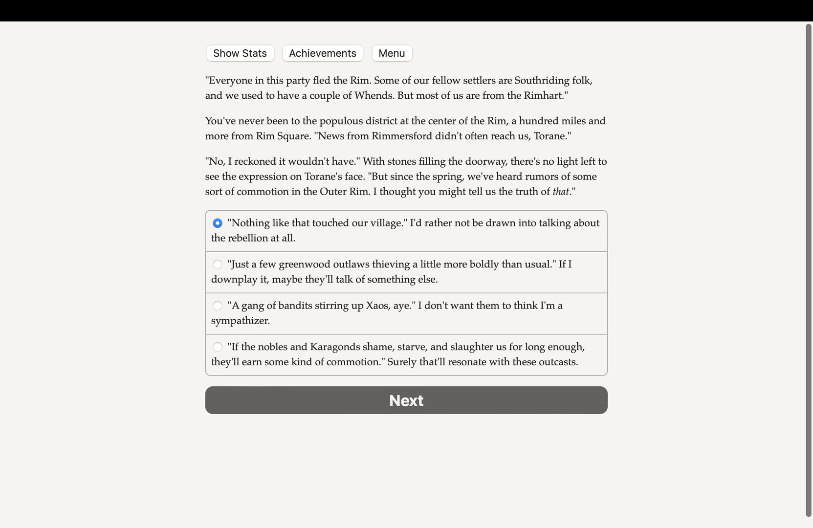 Choice of Rebels: Uprising, where your choices control the story. It's entirely text-based, without graphics or sound effects, and fueled by the vast, unstoppable power of your imagination.