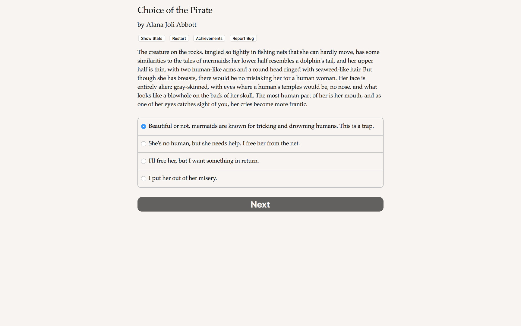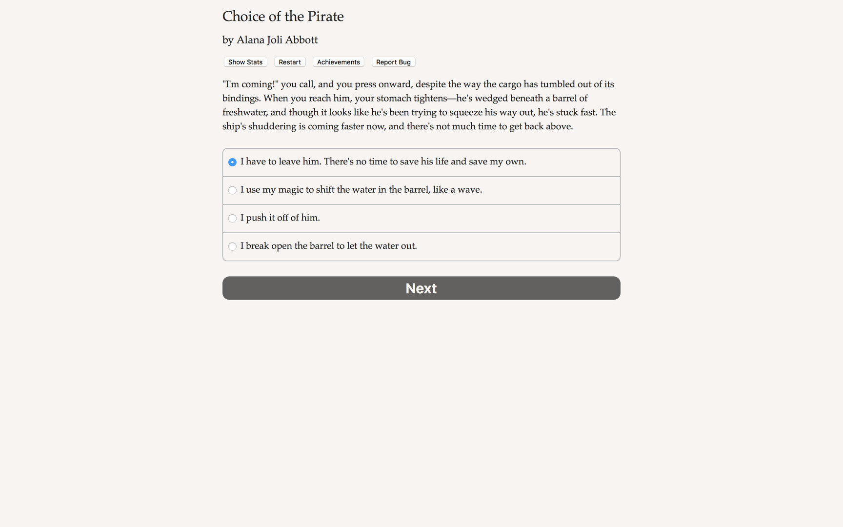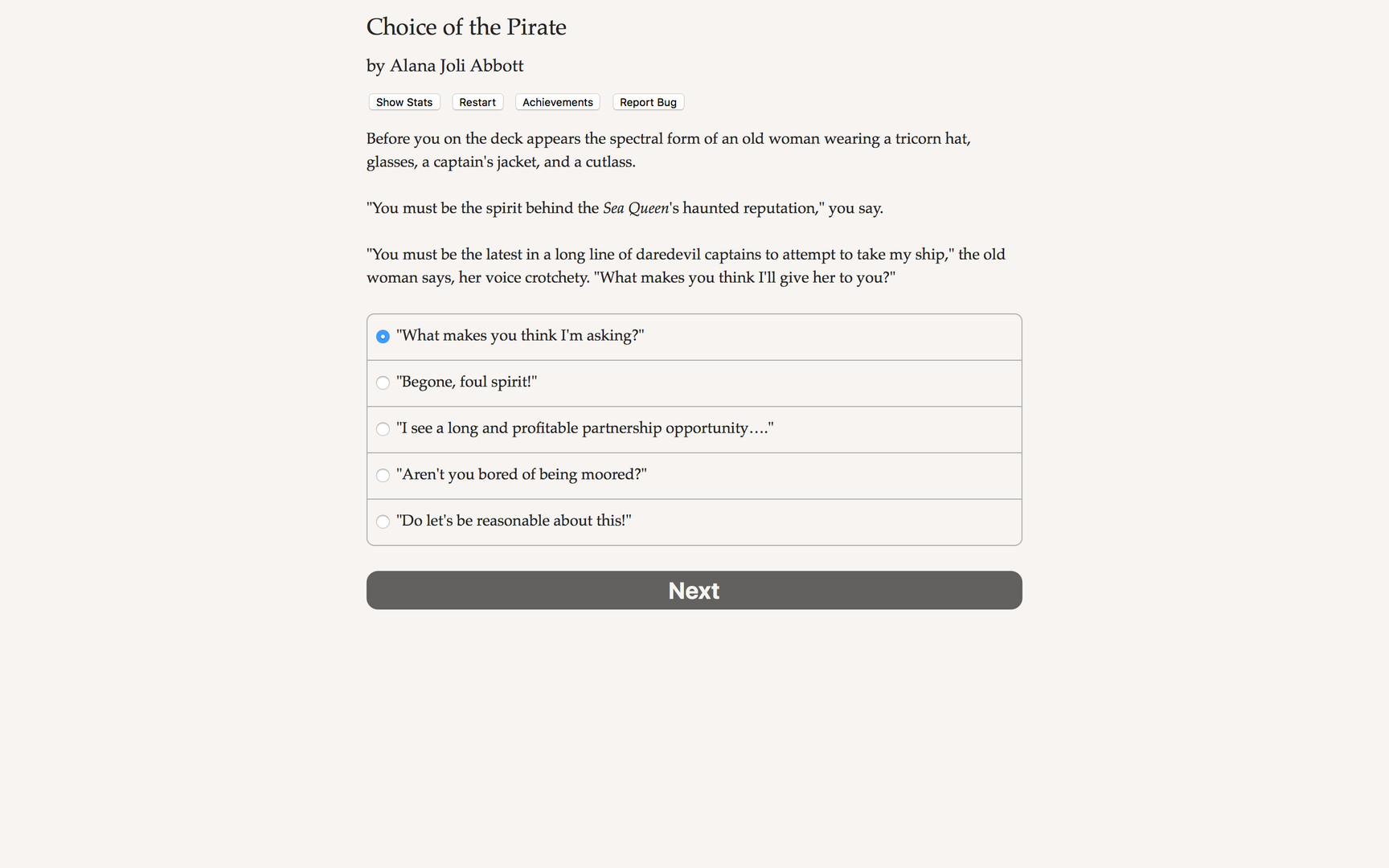 "Choice of the Pirate" is a fast-paced swashbuckler of an interactive novel by Alana Joli Abbott, author of "Choice of Kung Fu" and "Showdown at Willow Creek." Your choices control the story. It's entirely text-based—165,000 words, without graphics or sound effects—and fueled by the vast, unstoppable power of your imagination.