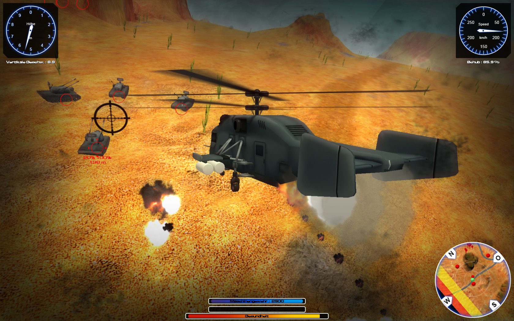Escape your opponents with avidly daring maneuvers and become a hunter, who knows no mercy! Fight against your enemies in dramatic 3D air battles, experience the detailed environment of the battlefields, experience thrilling missions and dive into the action of air combat. Six different helicopters from three different countries (D, USA, Russia) are waiting to be taken to the battlefields. Face hostile pilots, marine units or the heavily armored ground forces. Embark on a mission that requires all your flying skills!