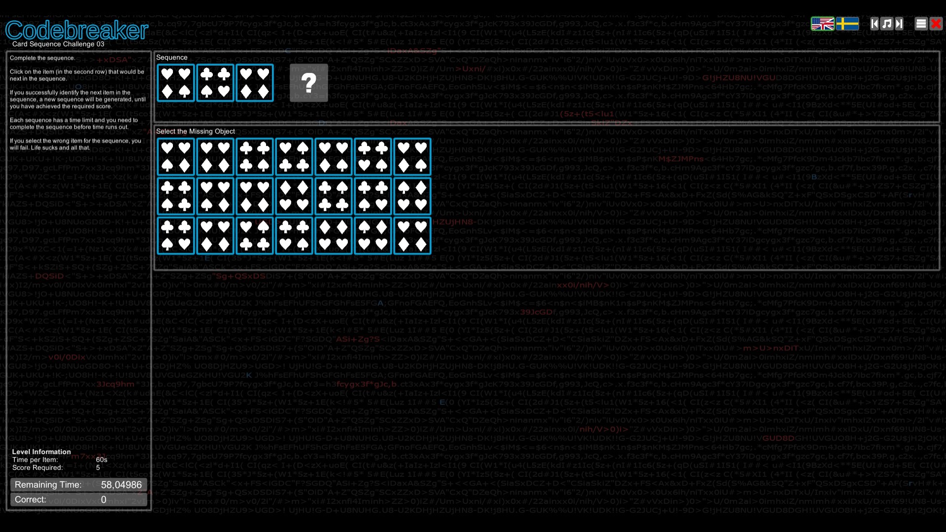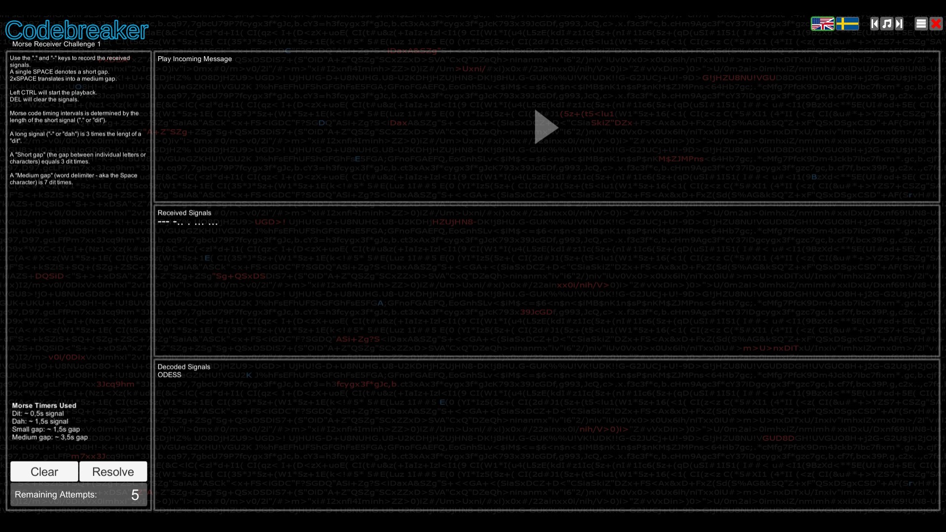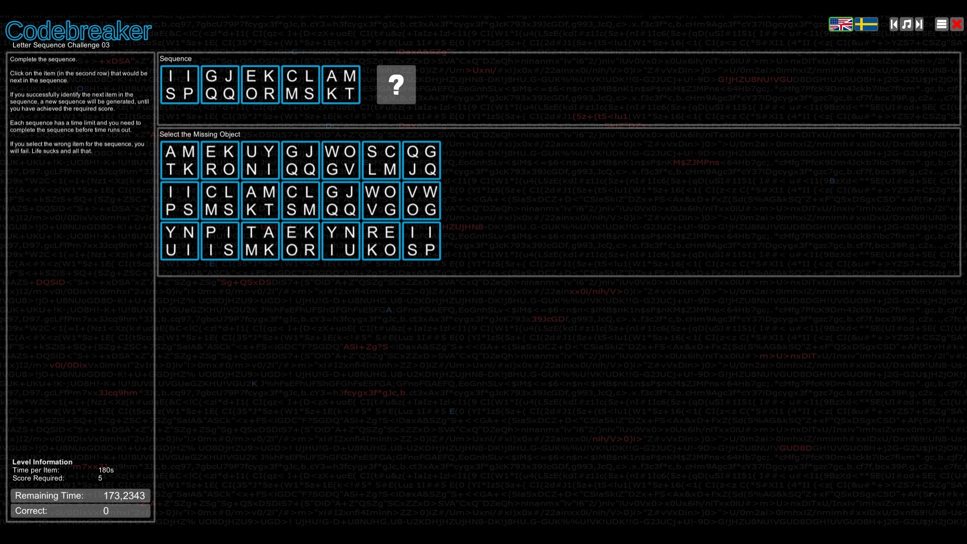 Crack character substitution ciphers. Transmit or receive messages in Morse Code. Decode binary and hexadecimal characters. Memorize sequences of numbers, letters or images. Identify the missing item in a sequence of characters or symbols. Do you have what it takes to be a Codebreaker?