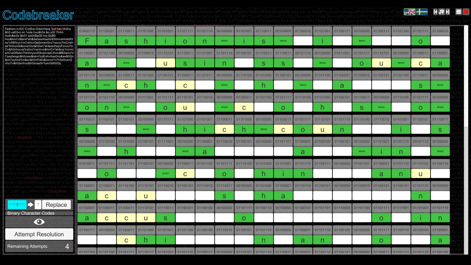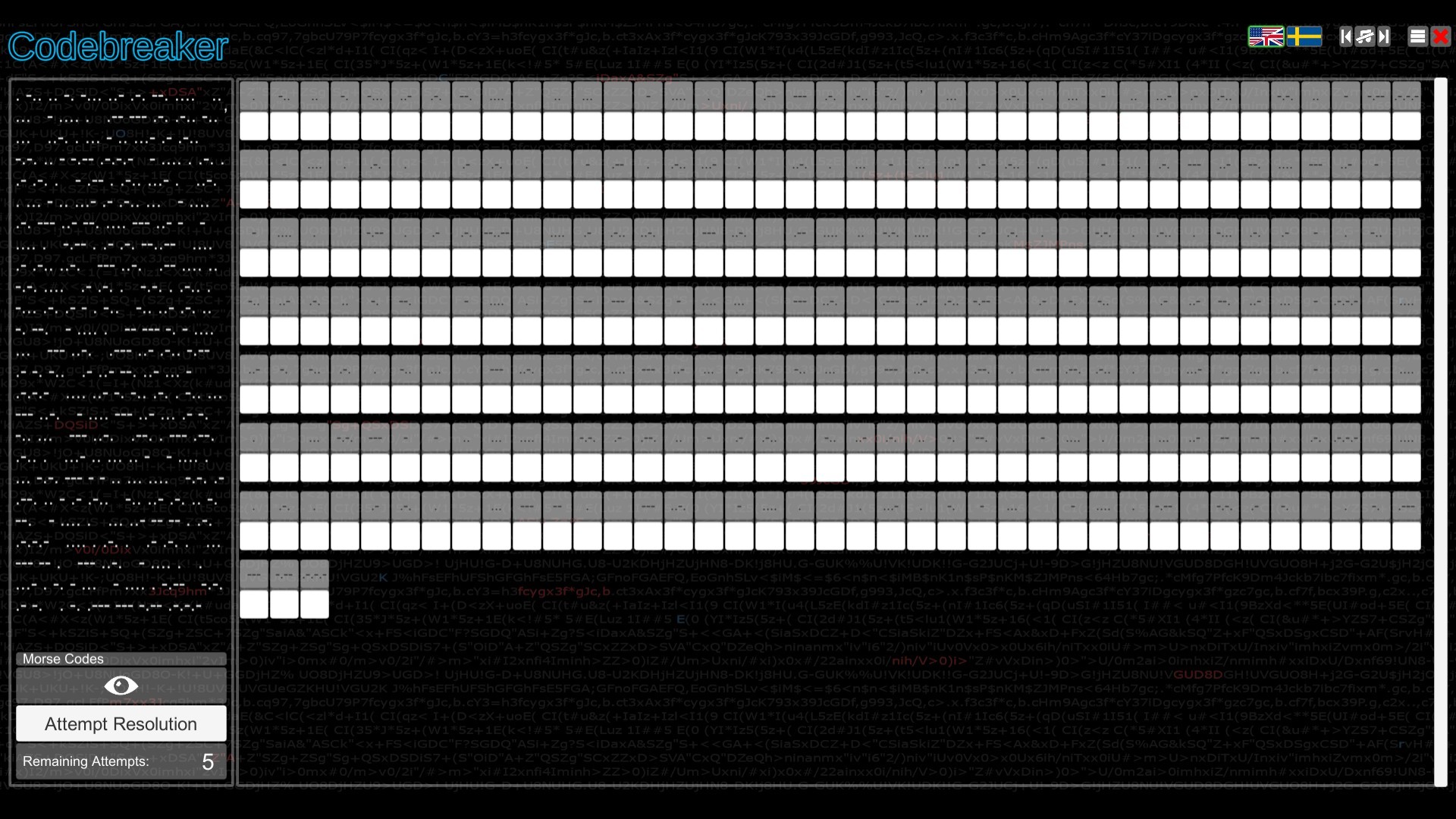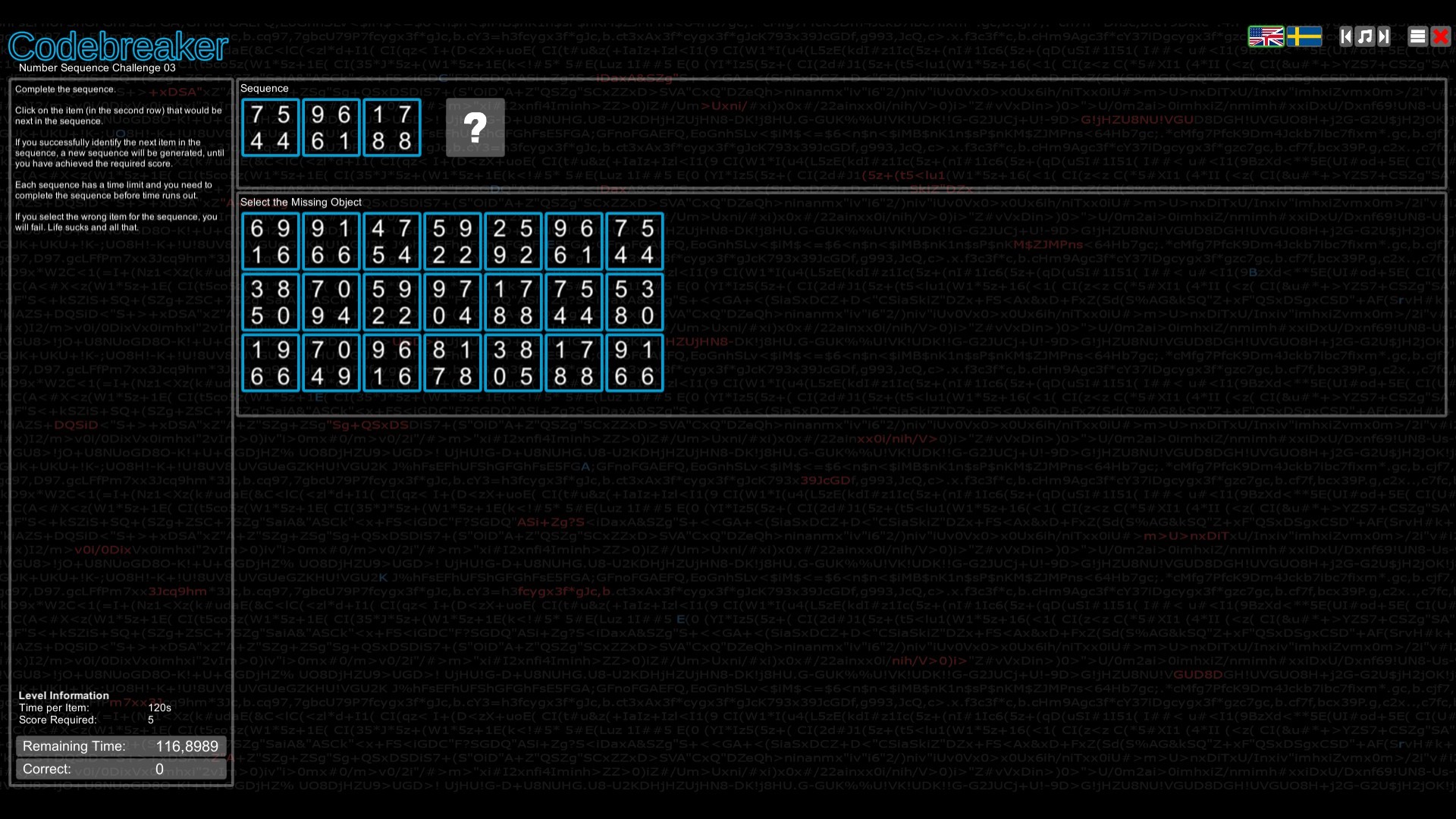 Crack character substitution ciphers. Transmit or receive messages in Morse Code. Decode binary and hexadecimal characters. Memorize sequences of numbers, letters or images. Identify the missing item in a sequence of characters or symbols. Do you have what it takes to be a Codebreaker?