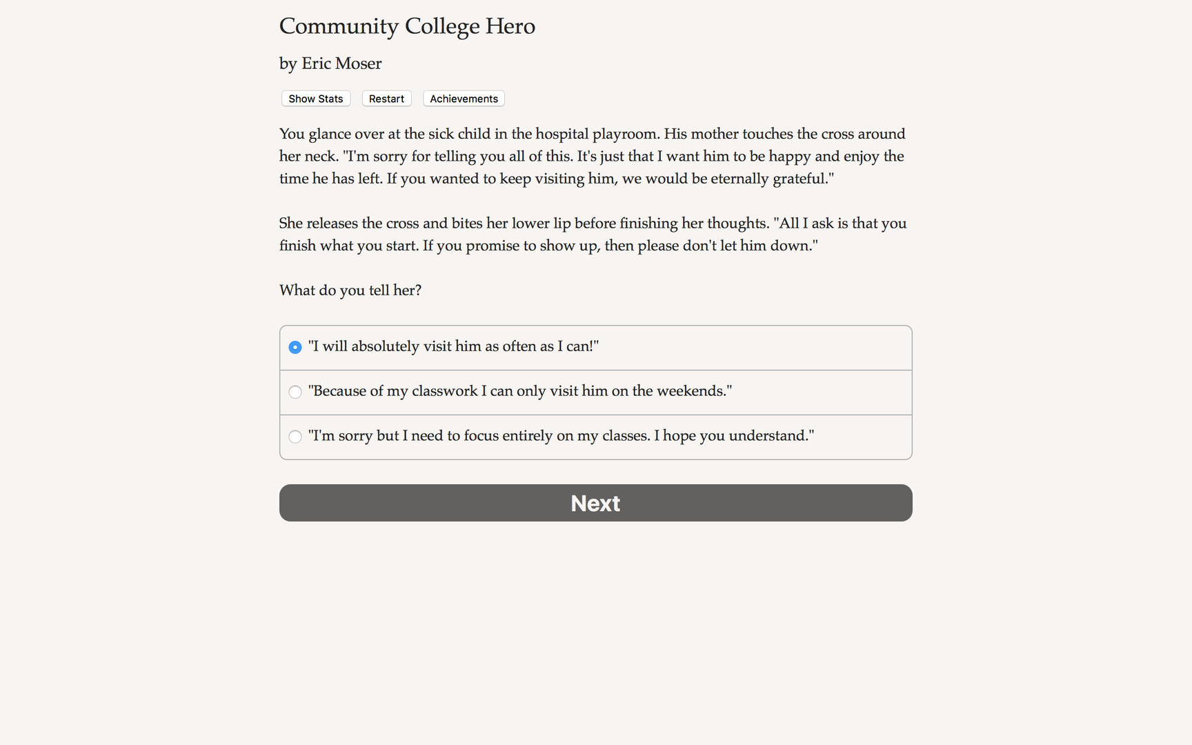 "Community College Hero: Trial by Fire" is a thrilling 168,000-word interactive novel by Eric Moser, where your choices control the story. It's entirely text-based--without graphics or sound effects--and fueled by the vast, unstoppable power of your imagination.