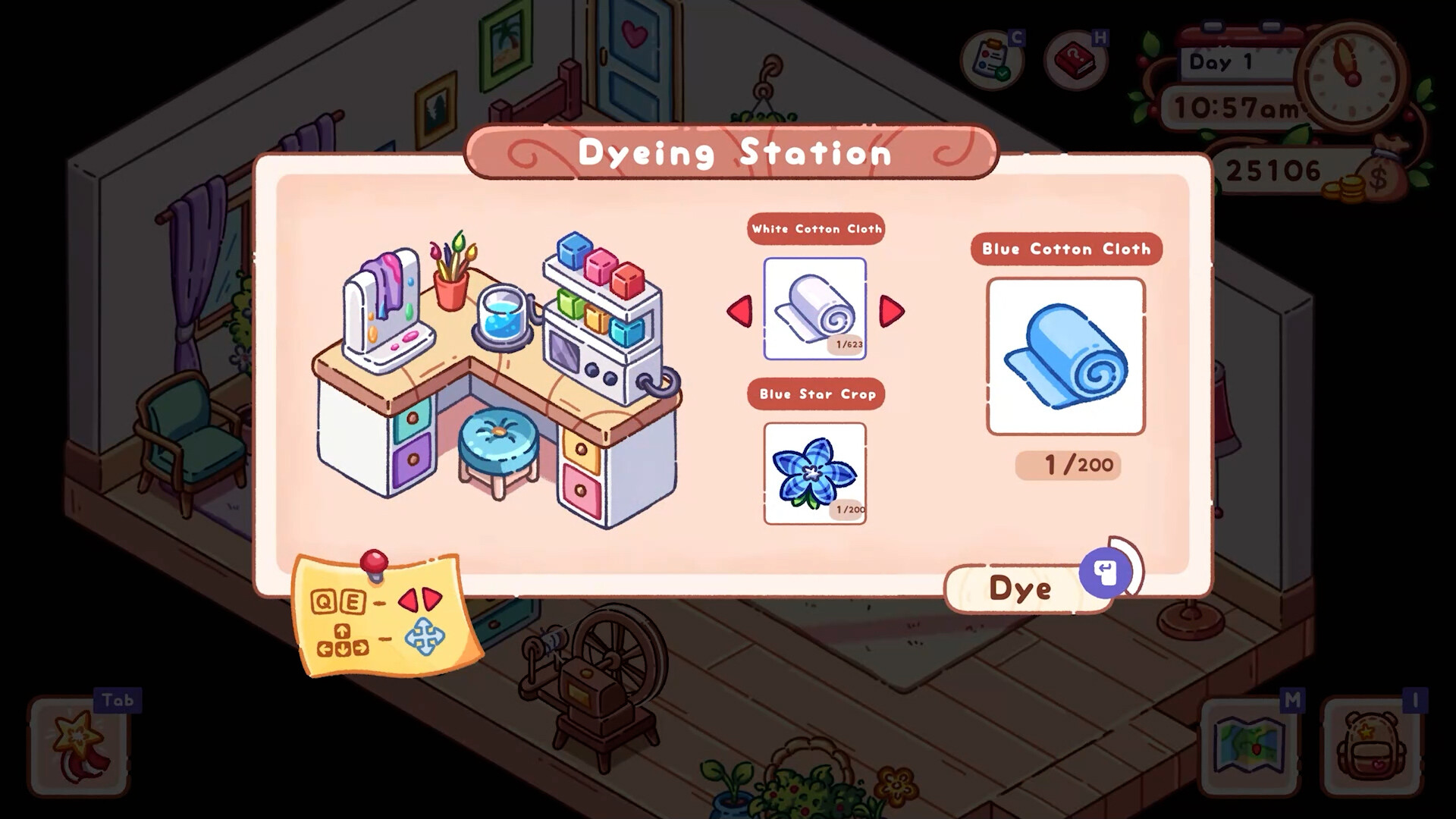 Your atelier is the heart of Cottonville’s fashion world! With over 60 clothing designs and multiple color variations, you can sew, dye, and customize garments using a set collection of sewing patterns to match your customers' needs. Listen to their requests, mix and match fabrics, and create outfits that suit their personalities.