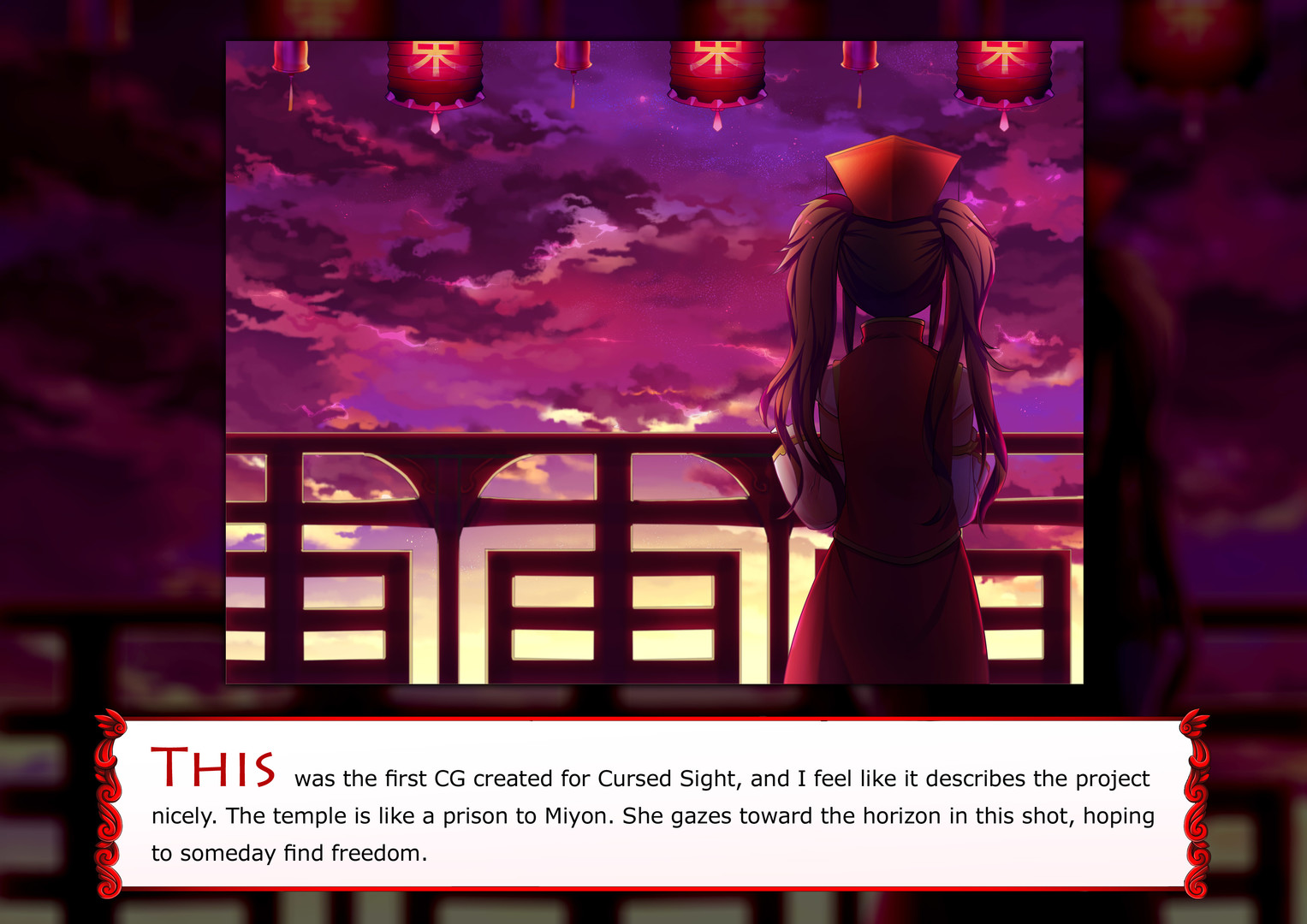 The digital artbook of Cursed Sight. Featured inside are the sprites, backgrounds and CGs used in the game. The creator's thoughts are included next to each image.