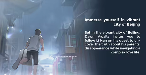 Dawn Awaits is a 2D narrative adventure that creates an experience akin to controlling an anime movie. The story follows Li Han, a young noodle shop delivery man, whose heart is caught between a school friend and a female teacher to whom he is betrothed in repayment of a debt of gratitude.