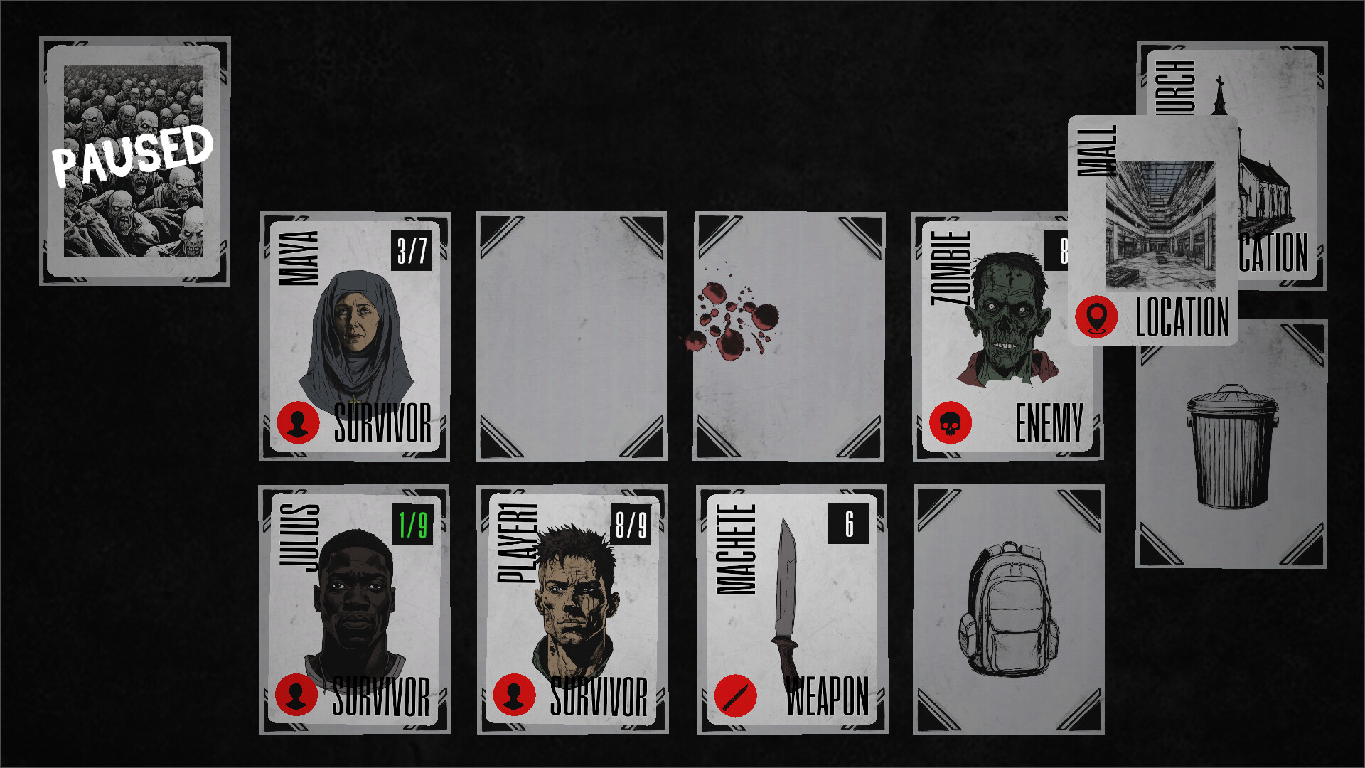 Fight your way through a zombie-infested city in search of rescue. Wield a variety of single-use melee weapons and reloadable ranged weapons to take down the undead. Increase your chances of survival by rescuing other survivors and searching for first aid kits and other usable items along the way. Each deck is randomized and reshuffled as you progress through different locations to ensure a unique play though every time.