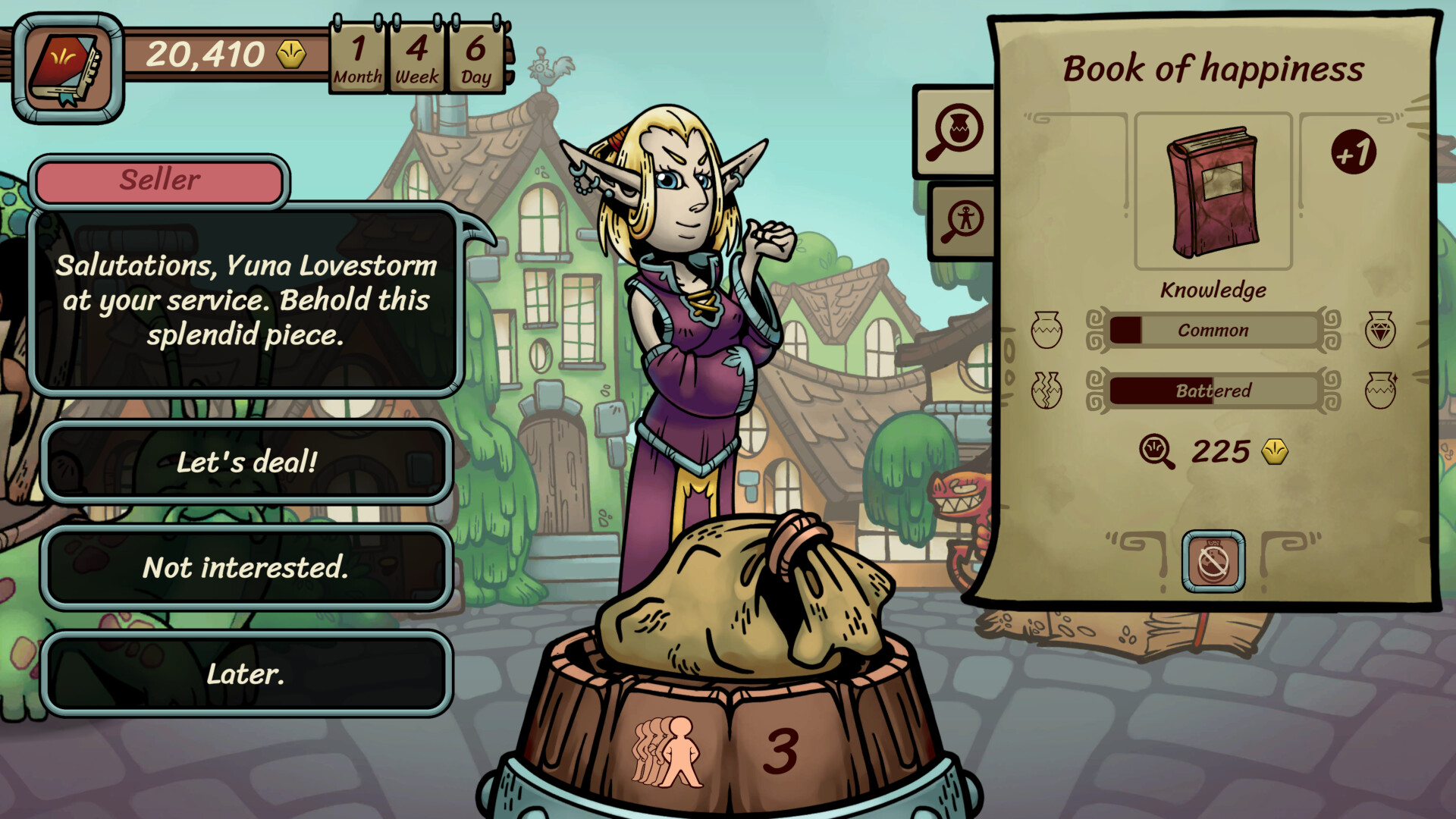 Your employees will also craft magic potions for you, special magic blends that can also be acquired through quests that empower your dealer’s skills and give you advantages during your negotiations, for example, by brainwashing a customer. Are they legal? Who knows, but their effects are truly incredible to buff your skills!