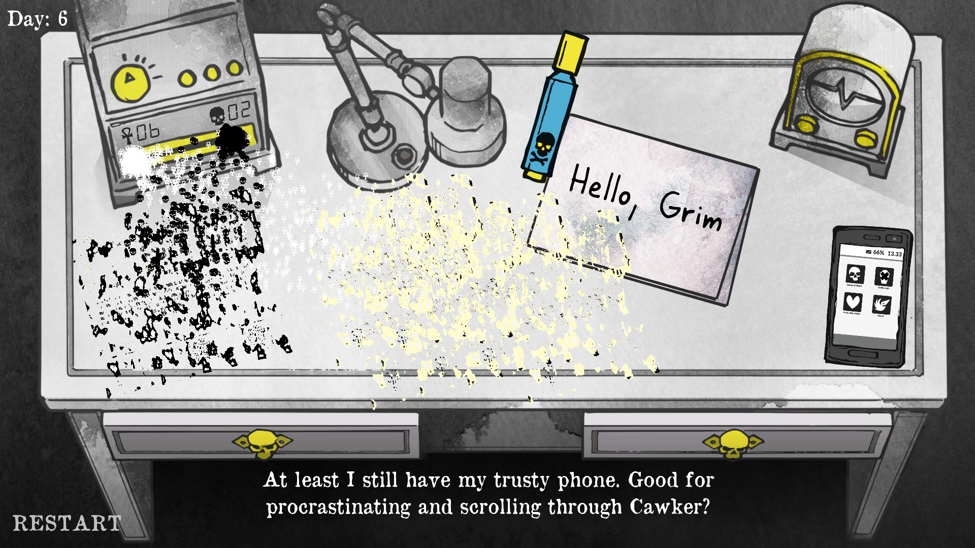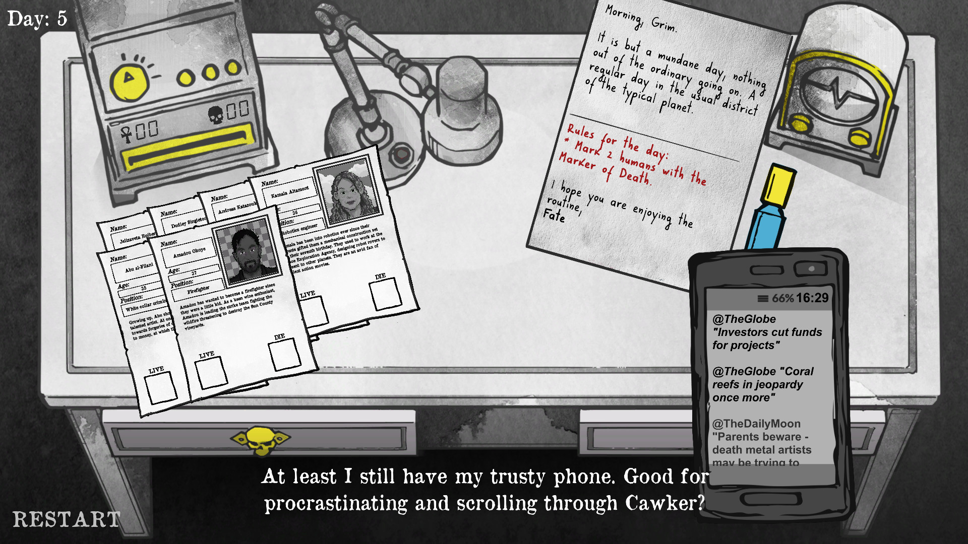 In this 2D, narrative-based game, you assume the role of the Grim Reaper... on an office job. Your job is to decide which people are going to live or die. The consequences of your choices are yours to bear, while the mystery of your incarnation awaits revelation!