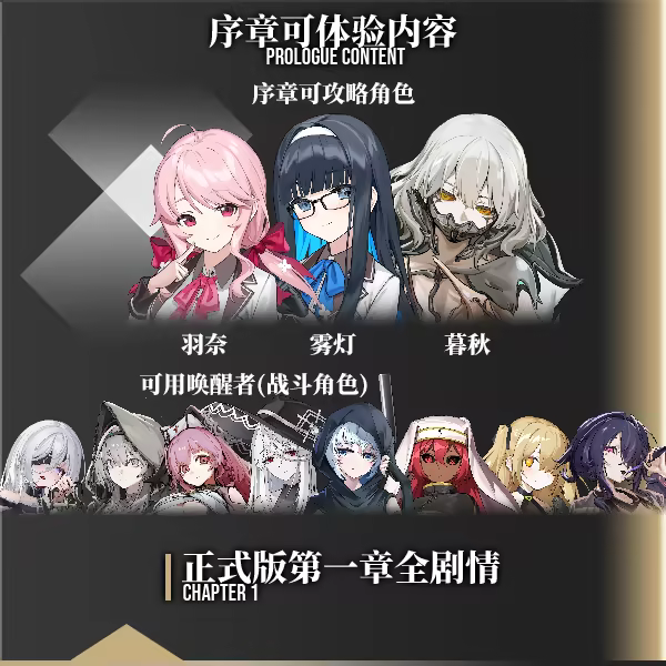 在测试版中,你将能体验到第一章的全部剧情,并与「羽奈」、「雾灯」两位学生,以及引导者「暮秋」一同探索「伊礼音高级中学」隐藏的秘密。