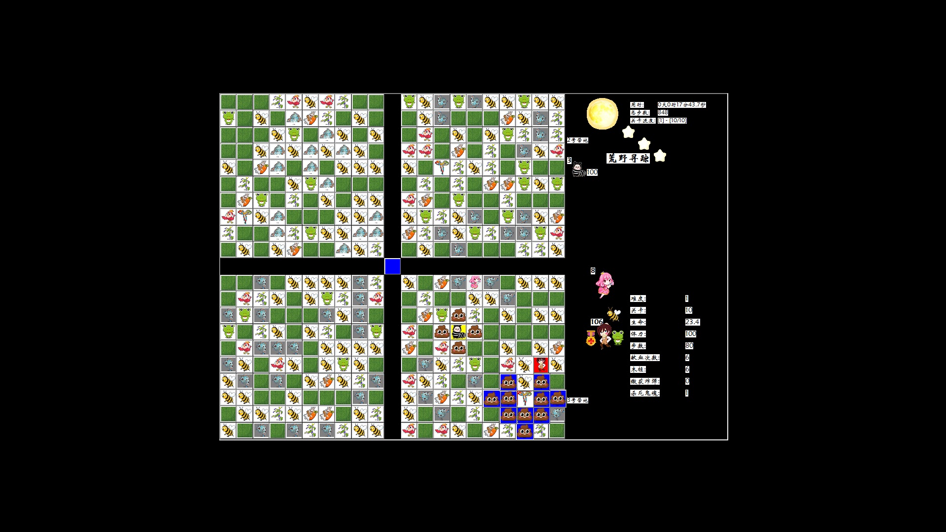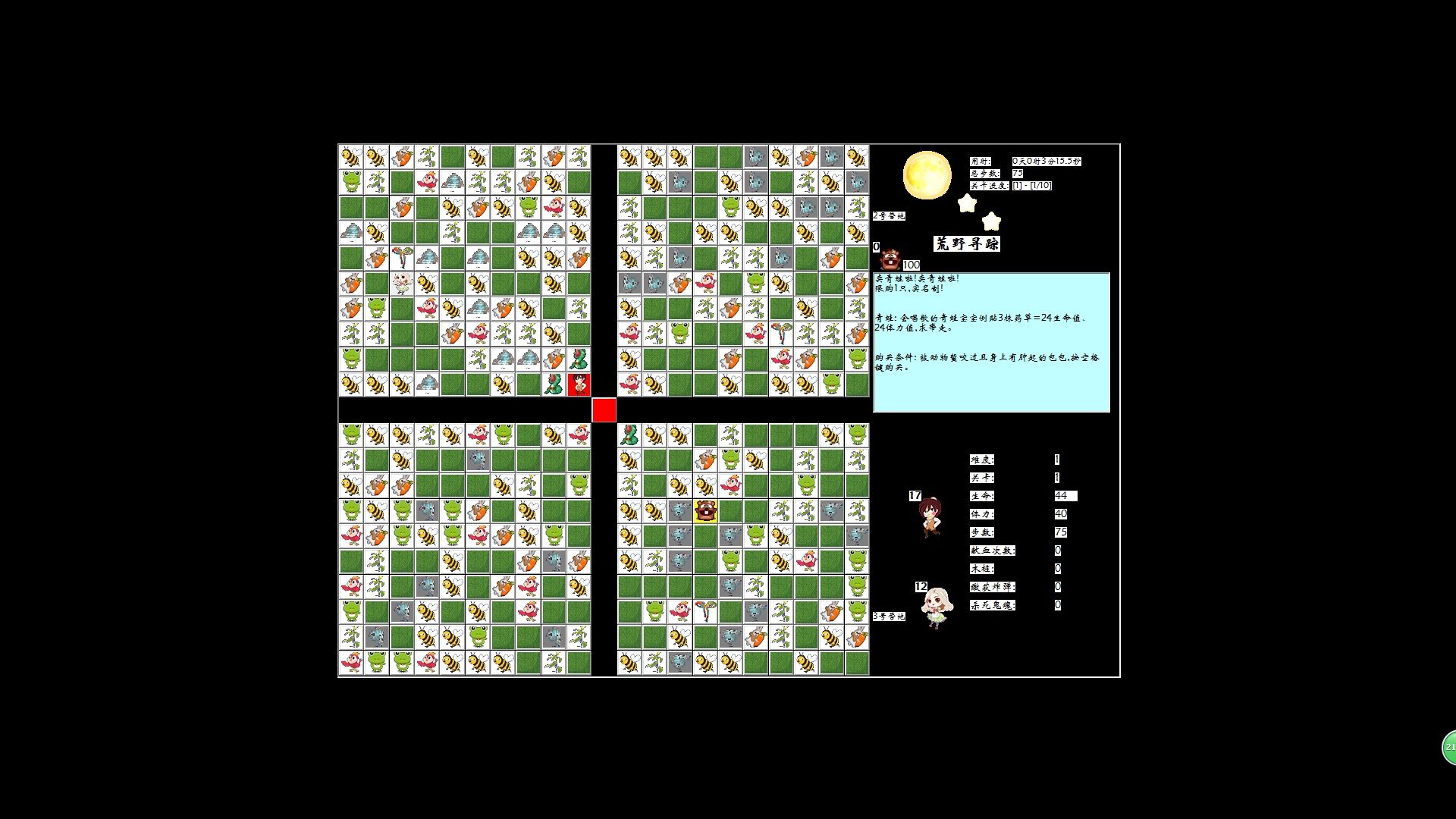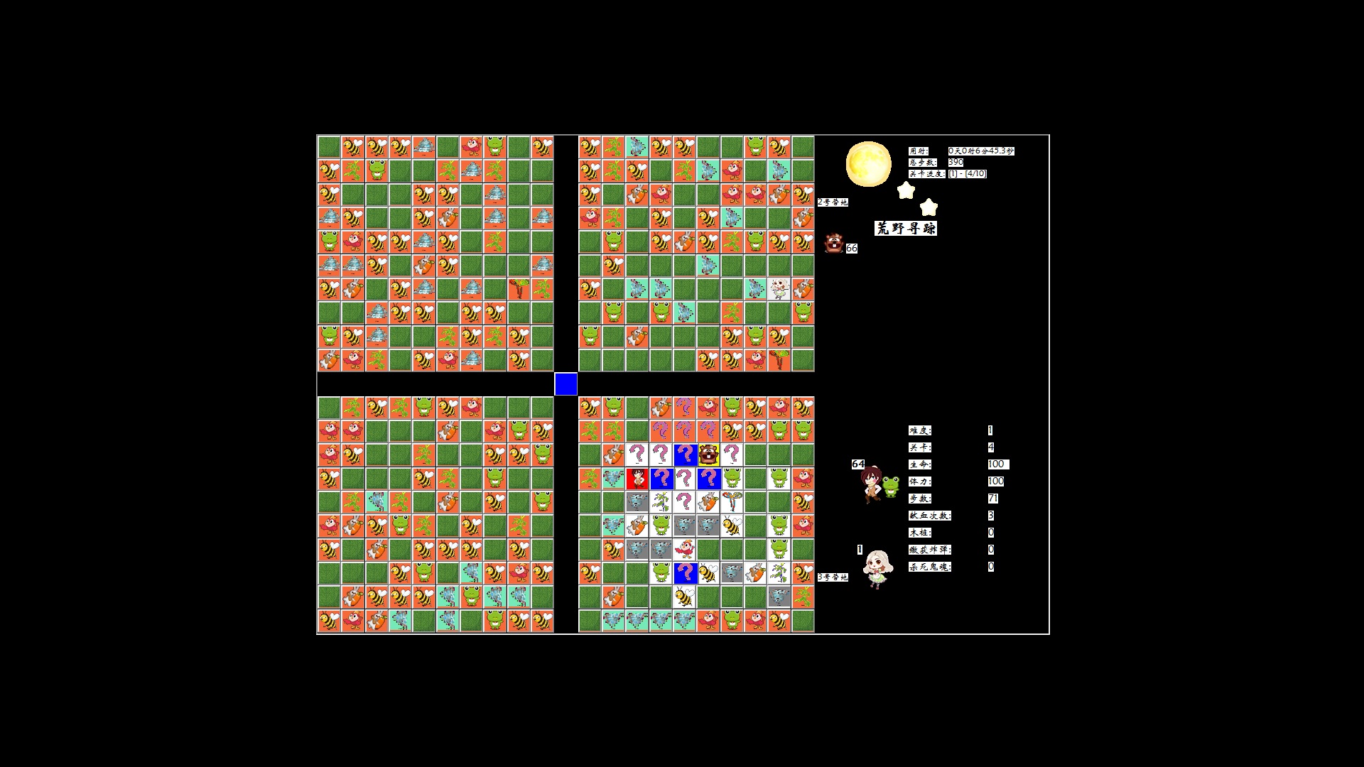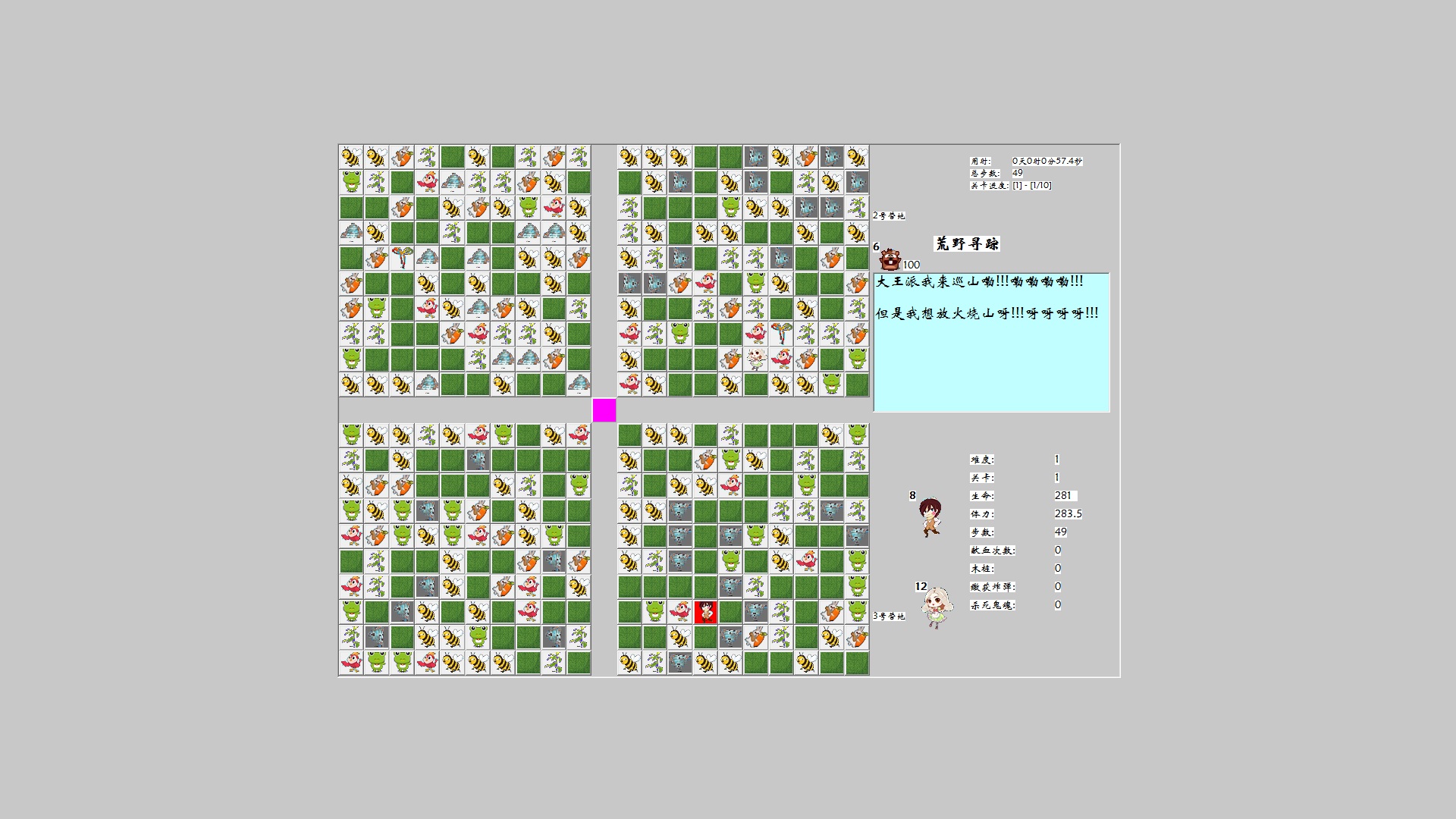 荒野寻踪是一款在格子上移动冒险的策略游戏。游戏共设计有10个关卡,玩家需要通过所有关卡并击败4个守关BOSS才能救出女主角;救援全程需规避小怪和BOSS的伤害来保持生命值和体力值大于0,可以选择3只不同辅助能力的某1只萌宠一起冒险;遭遇BOSS前还需要破解1个插旗子找线索的谜题。玩家可根据BOSS的攻击方式和移动规律来制定出快速将其击败的策略。
