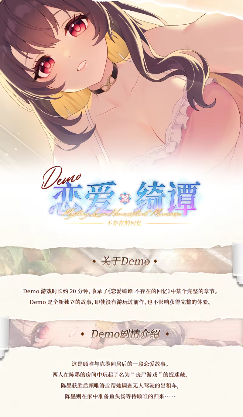 《恋爱绮谭 不存在的回忆》是国产悬疑恋爱AVG《恋爱绮谭》系列第三部作品,也是系列的解谜篇。在前作《不存在的夏天》与《不存在的真相》中留下的诸多谜团,将在《恋爱绮谭 不存在的回忆》中解答,系列的故事还在继续。