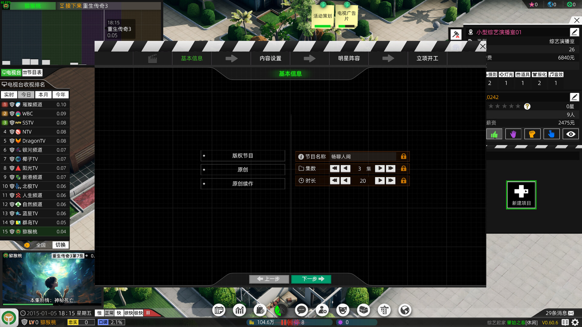 电视台模拟国是一款融合了探索,建造,数值养成等玩法的模拟经营游戏。您将扮演某处小电视台的新任台长。在广阔的大洲王国中,同其他电视台争夺天下。您可以通过多种方式做大做强自己的电视台,比如合理编排节目,拔高收视率,策划王牌综艺节目,高价拍卖节目首播权。打造精彩的新闻节目,一举收获天价广告赞助。还可以扮演星探,发掘大洲王国的下一个顶流艺人!