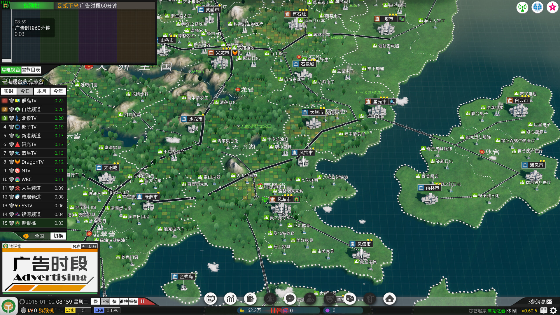 除了上述玩法以外,你的最终目标,是让全国的观众都看到自己的节目,打造称霸大洲王国的传媒帝国。 每一地的观众喜好,看电视的时间段都不相同,调整你的策略,网罗所有的电视信号!