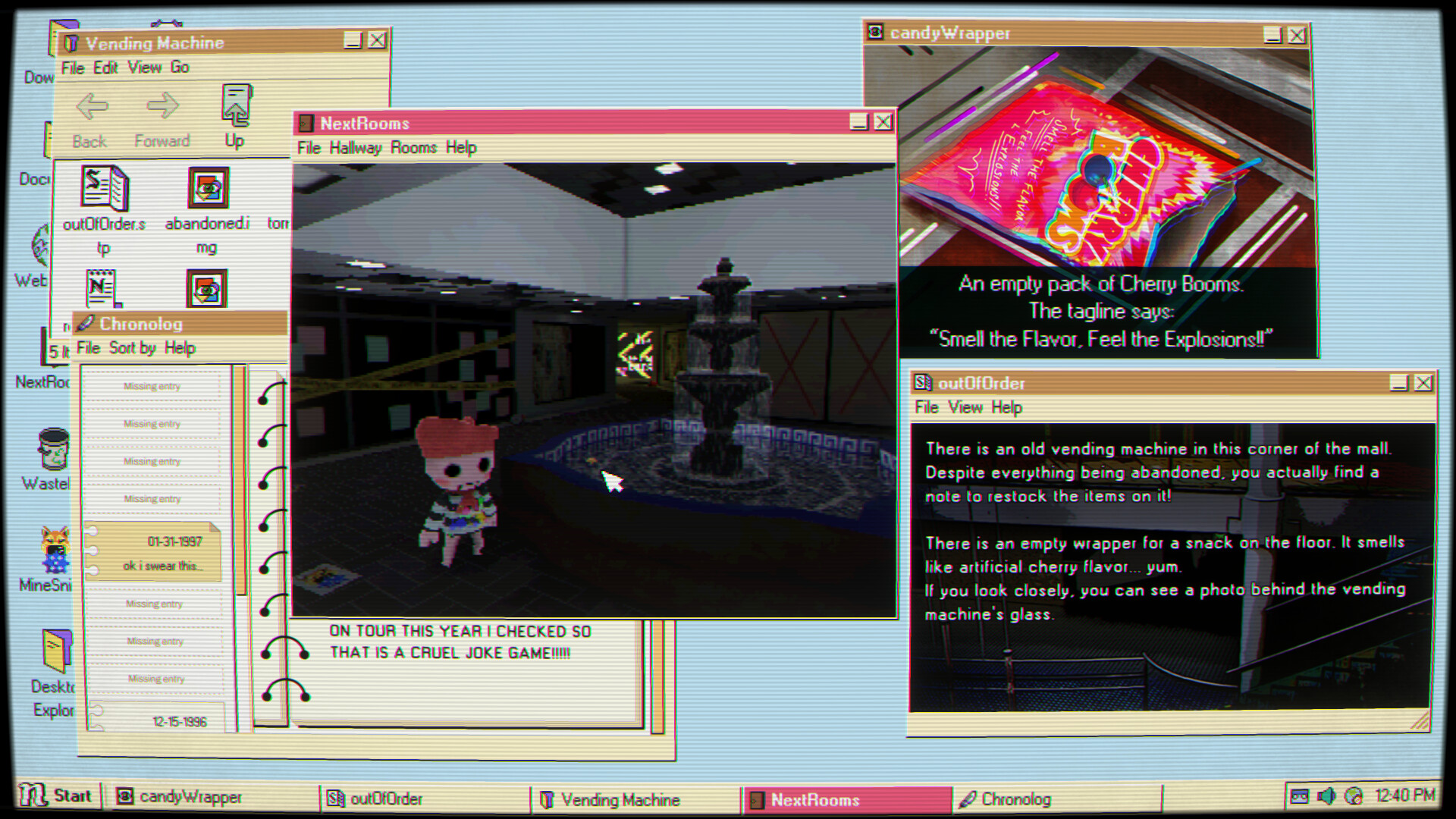 Solve puzzles using classic OS tools like: file explorers, chat logs, and corrupted applications.